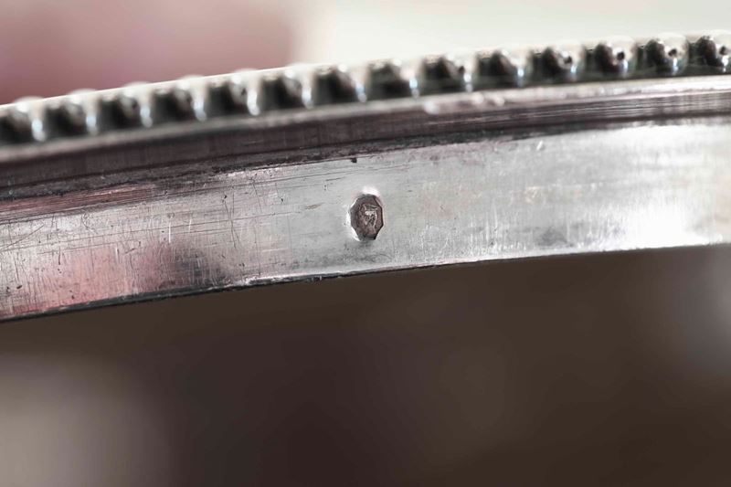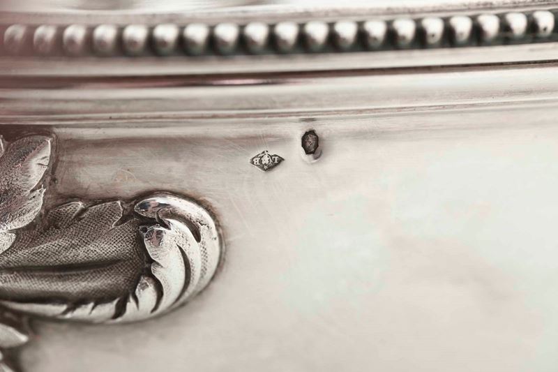Coppia di portavivande. Argento fuso, sbalzato e cesellato. Francia XIX secolo. Marchio per l’esportazione in uso dal 1838 e dell’argentiere LB con fiore e stella entro rombo (non identificato)