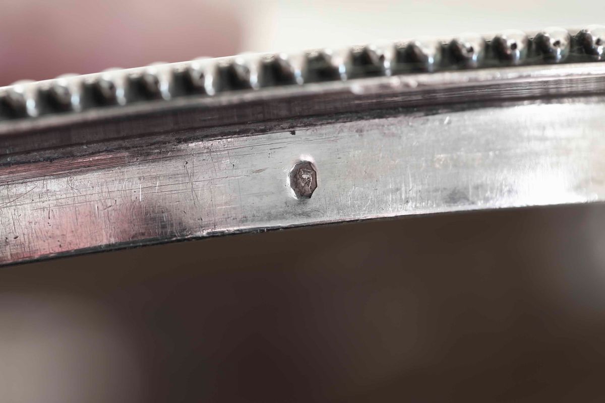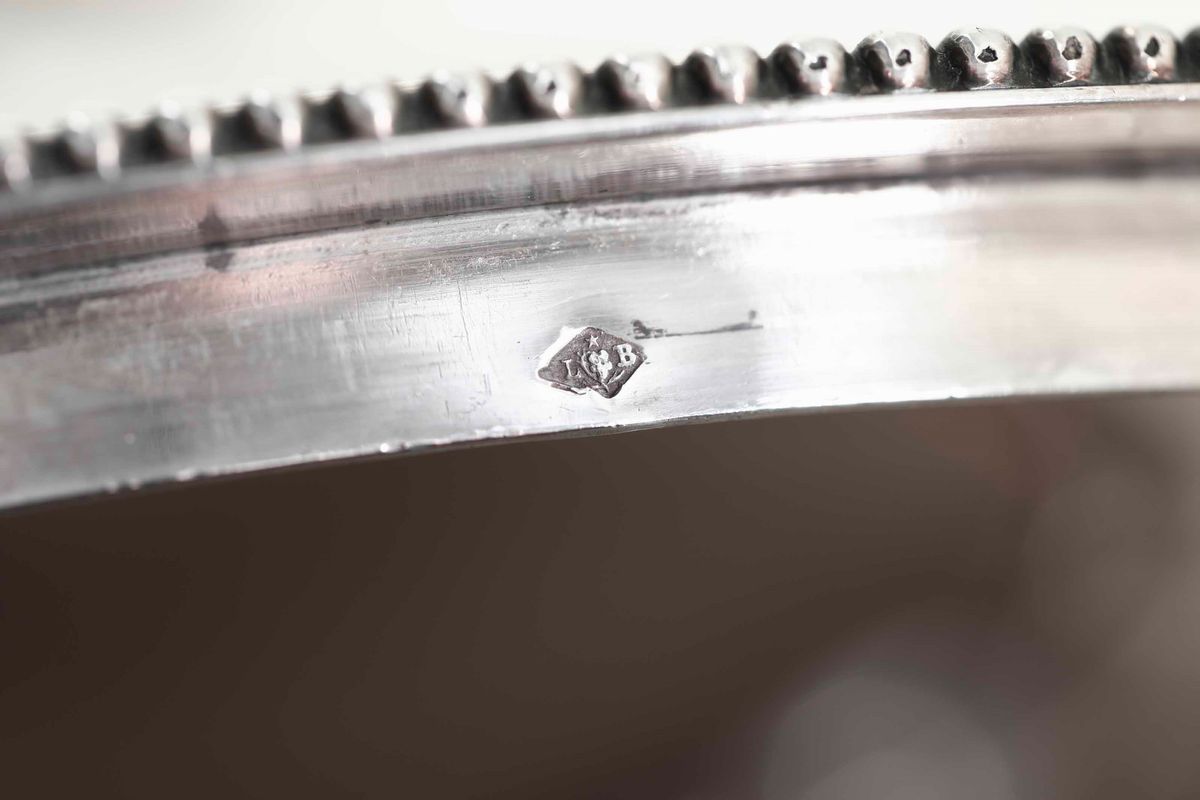 Eleganti decori a ramages intrecciate, bordo perlinato e monogramma coronato inciso