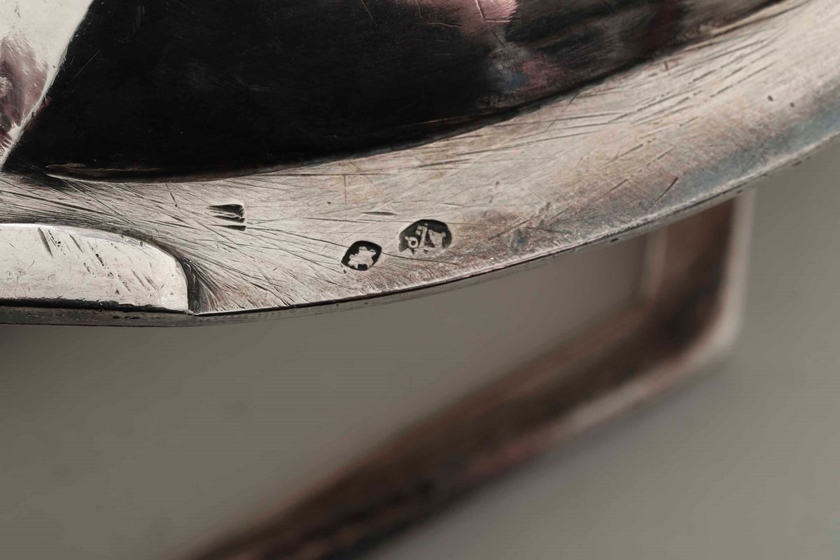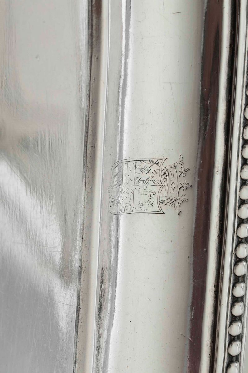 Elegante forma ovale con bordo perlinato e anse squadrate. Stemma nobiliare coronato inciso sul bordo
