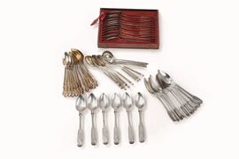12 cucchiaini in argento dorato. Mosca 1882 , 12 cucchiaini Mosca 1880 e 6 cucchiaini Mosca 1842. Del lotto fanno parte 12 cucchiaini Italia Turrita e 12 cucchiaini Francia XIX-XX secolo