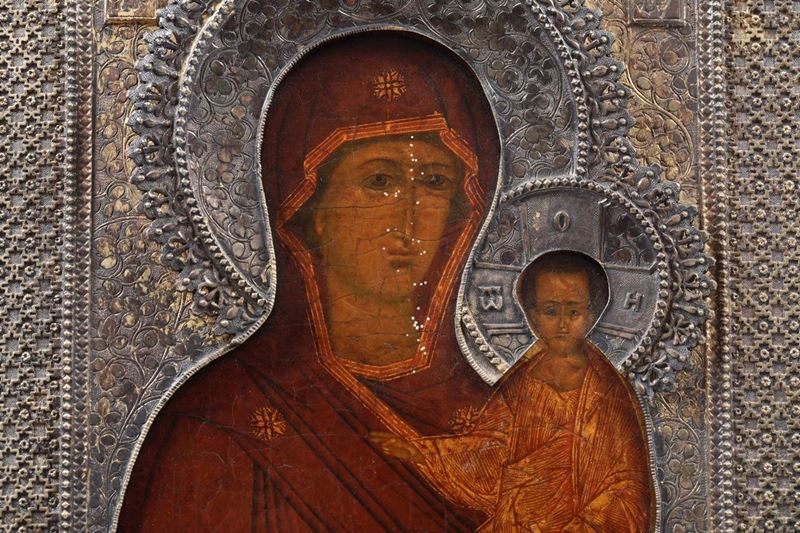 Madonna con Bambino. Icona su tavola. Probabile XVII secolo. Riza in argento sbalzato e cesellato. Mosca 1870. assaggiatore A.Svechin