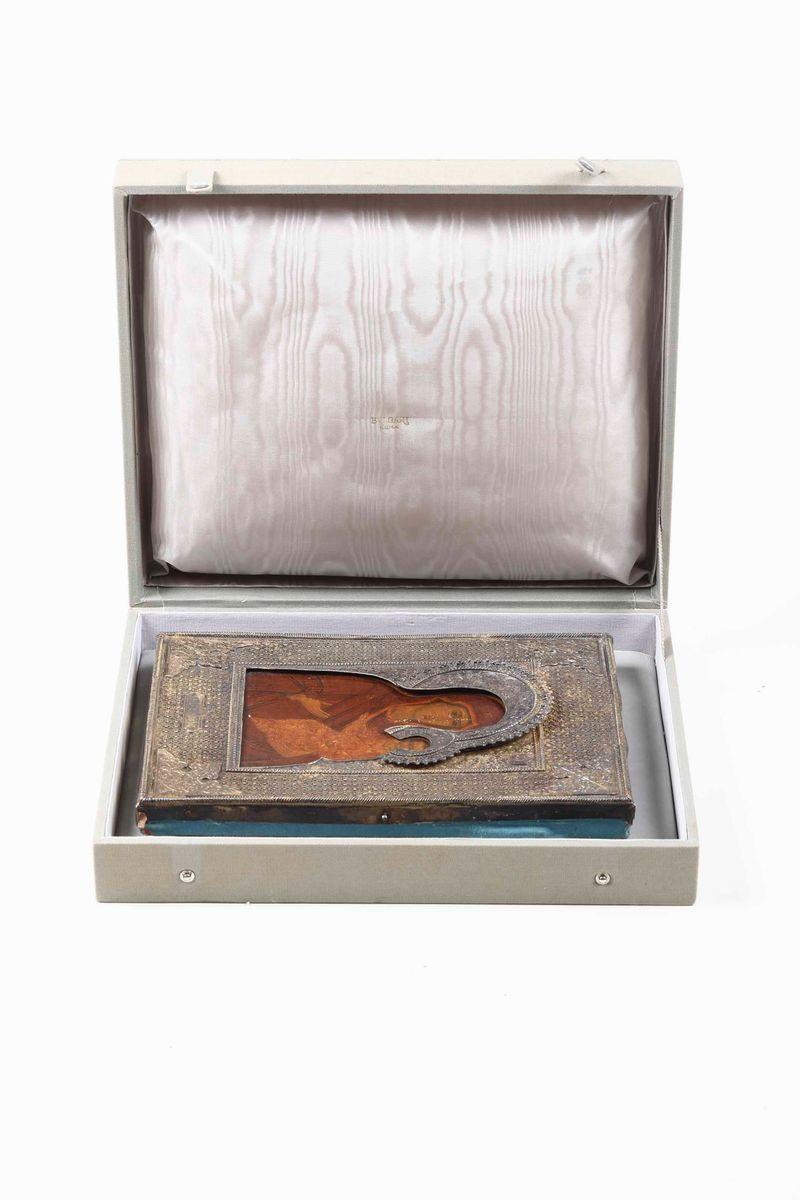 Madonna con Bambino. Icona su tavola. Probabile XVII secolo. Riza in argento sbalzato e cesellato. Mosca 1870. assaggiatore [..]