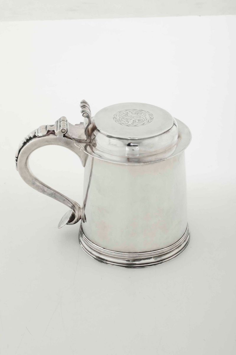 Tankard in argento fuso, sbalzato e cesellato. Inghilterra probabile XVIII secolo. Presente solo il marchio dell’argentiere [..]