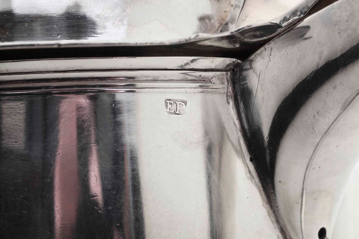 Tankard in argento fuso, sbalzato e cesellato. Inghilterra probabile XVIII secolo. Presente solo il marchio dell’argentiere EP entro rettangolo (non identificato)