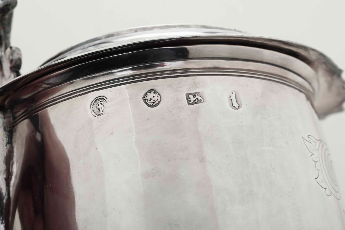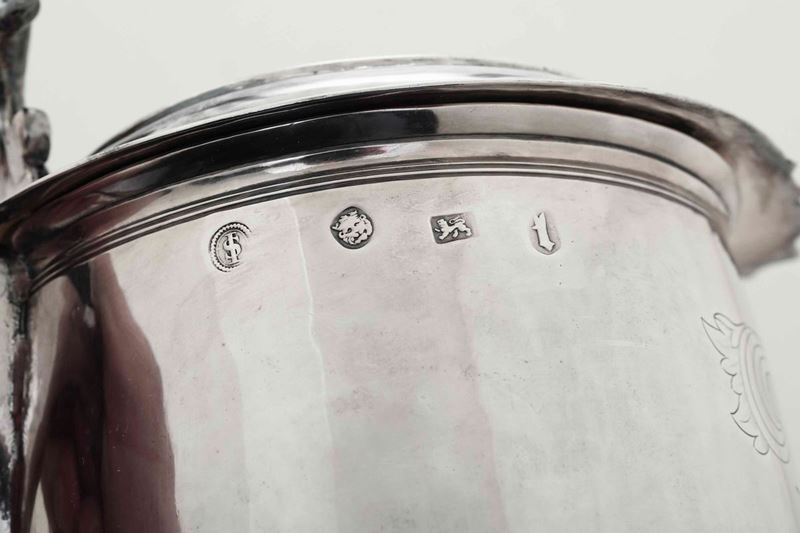 Tankard in argento fuso, sbalzato e cesellato. Londra 1688, marchio dell'argentiere con monogramma IS (non identificato)