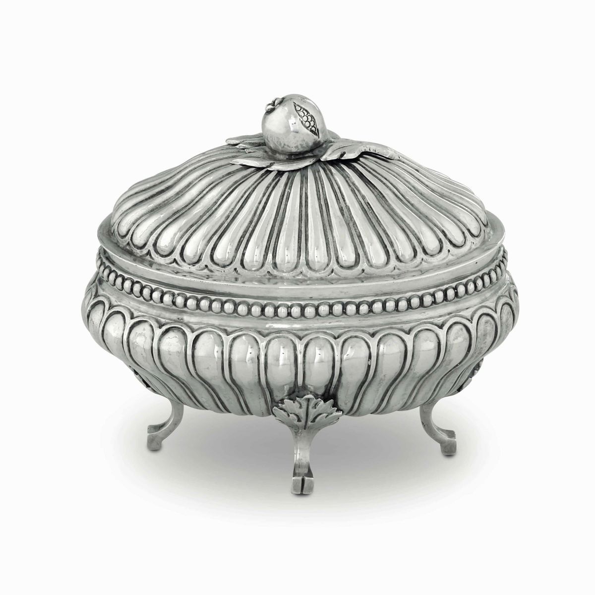 Zuccheriera. Argento fuso, sbalzato e cesellato. Torino terzo quarto del XVIII secolo. Assaggiatore e contrassaggiatore Giuseppe Fontana