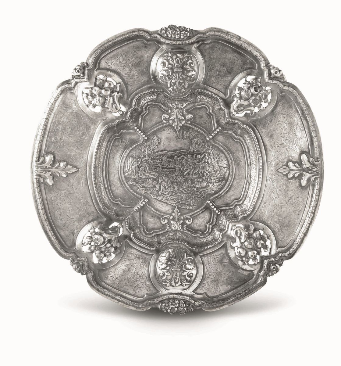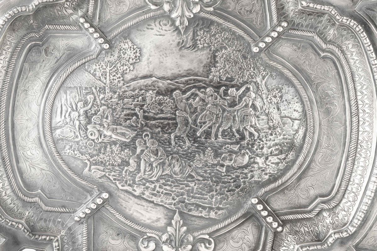 Grande piatto da parata circolare sagomato. Argento fuso,sbalzato e finemente cesellato. Argenteria artistica milanese dell'inizio del XX secolo, nei modi dell'orafo Stanislao Borghi