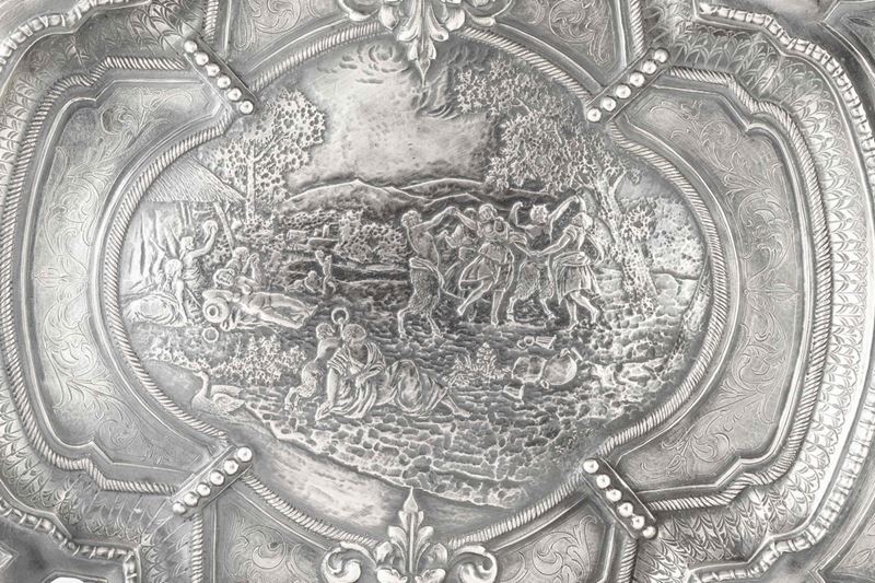 Grande piatto da parata circolare sagomato. Argento fuso,sbalzato e finemente cesellato. Argenteria artistica milanese dell'inizio [..]