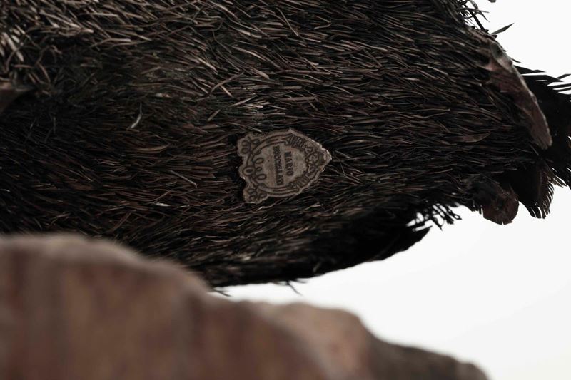 Quaglia. Argento su base in legno fossile. Argenteria artistica italiana del XX-XXI secolo. Firma Mario Buccellati su etichetta a scudo in argento