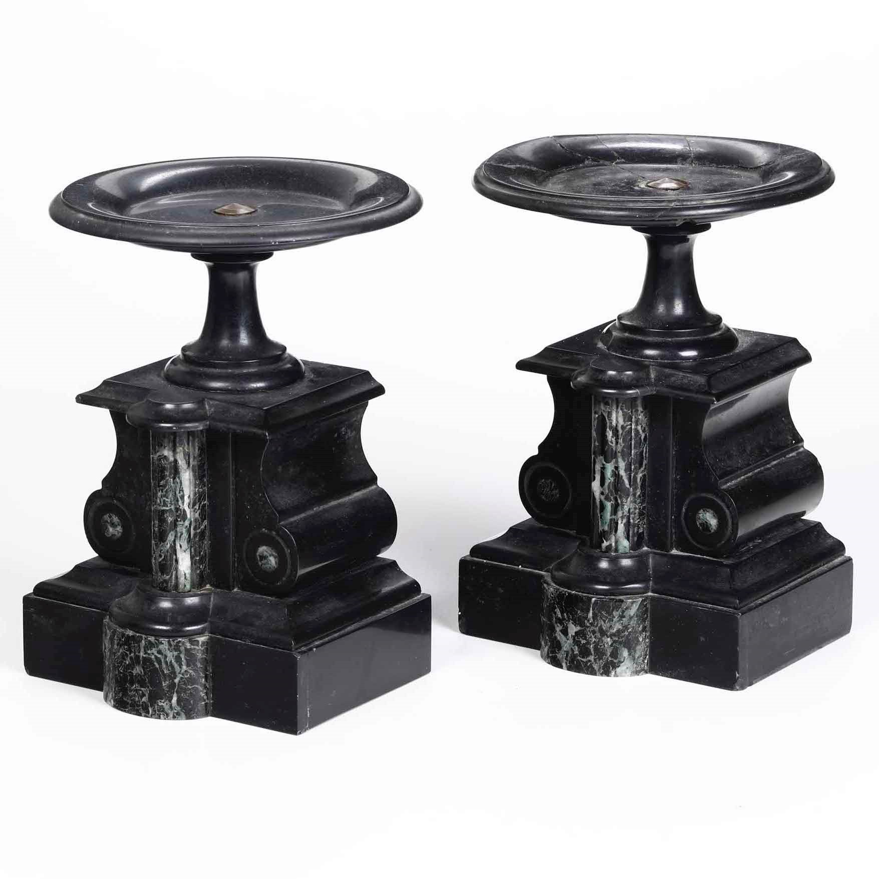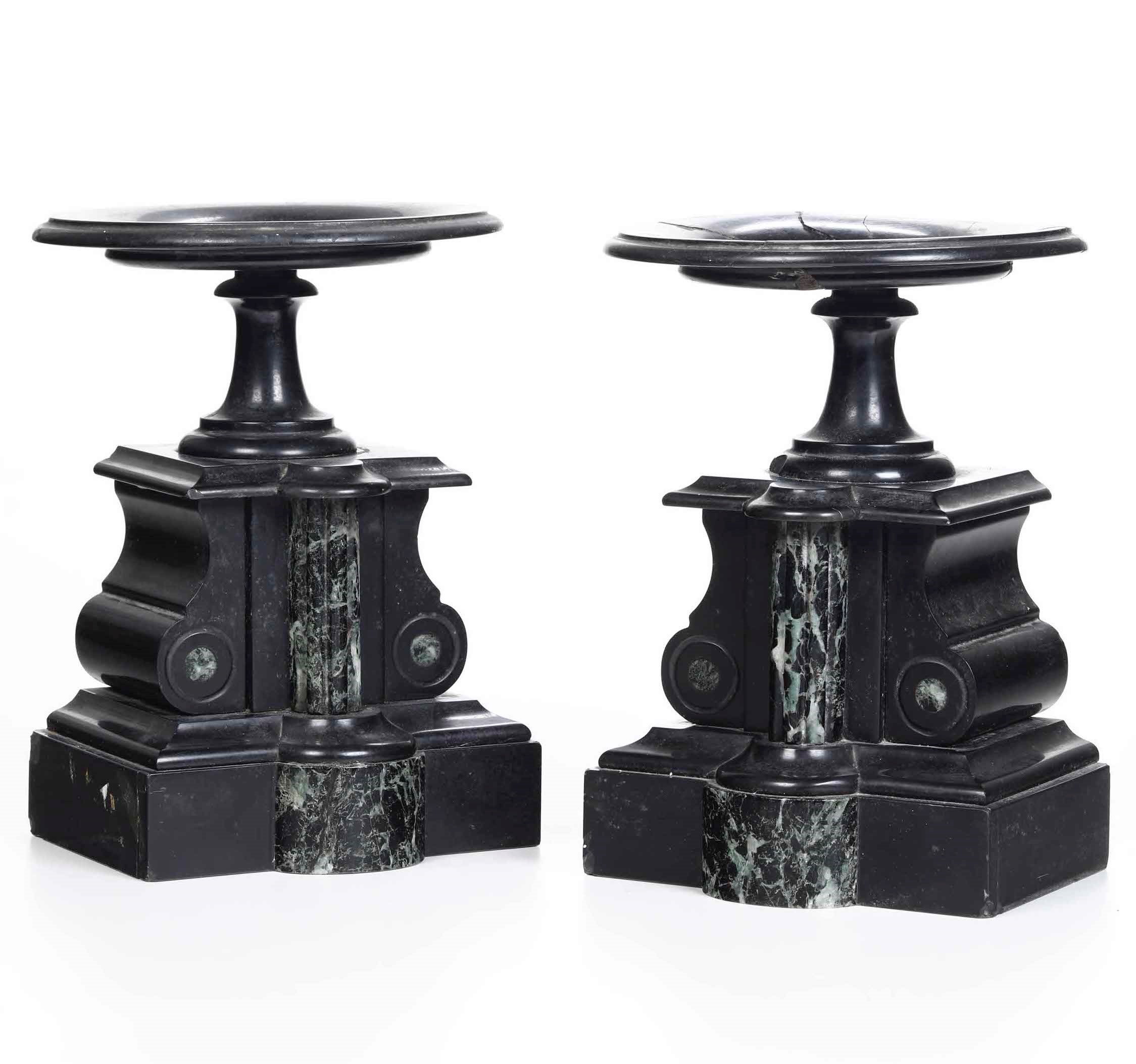 Coppia di alzate in marmo nero del Belgio e verde antico, XIX-XX secolo