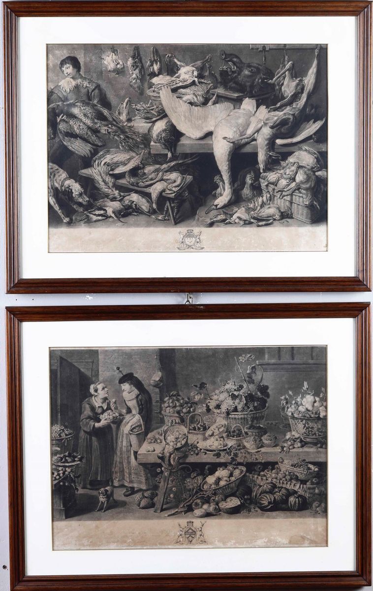 Gruppo di quattro incisioni Natura morta con selvaggina e Scene da mercato