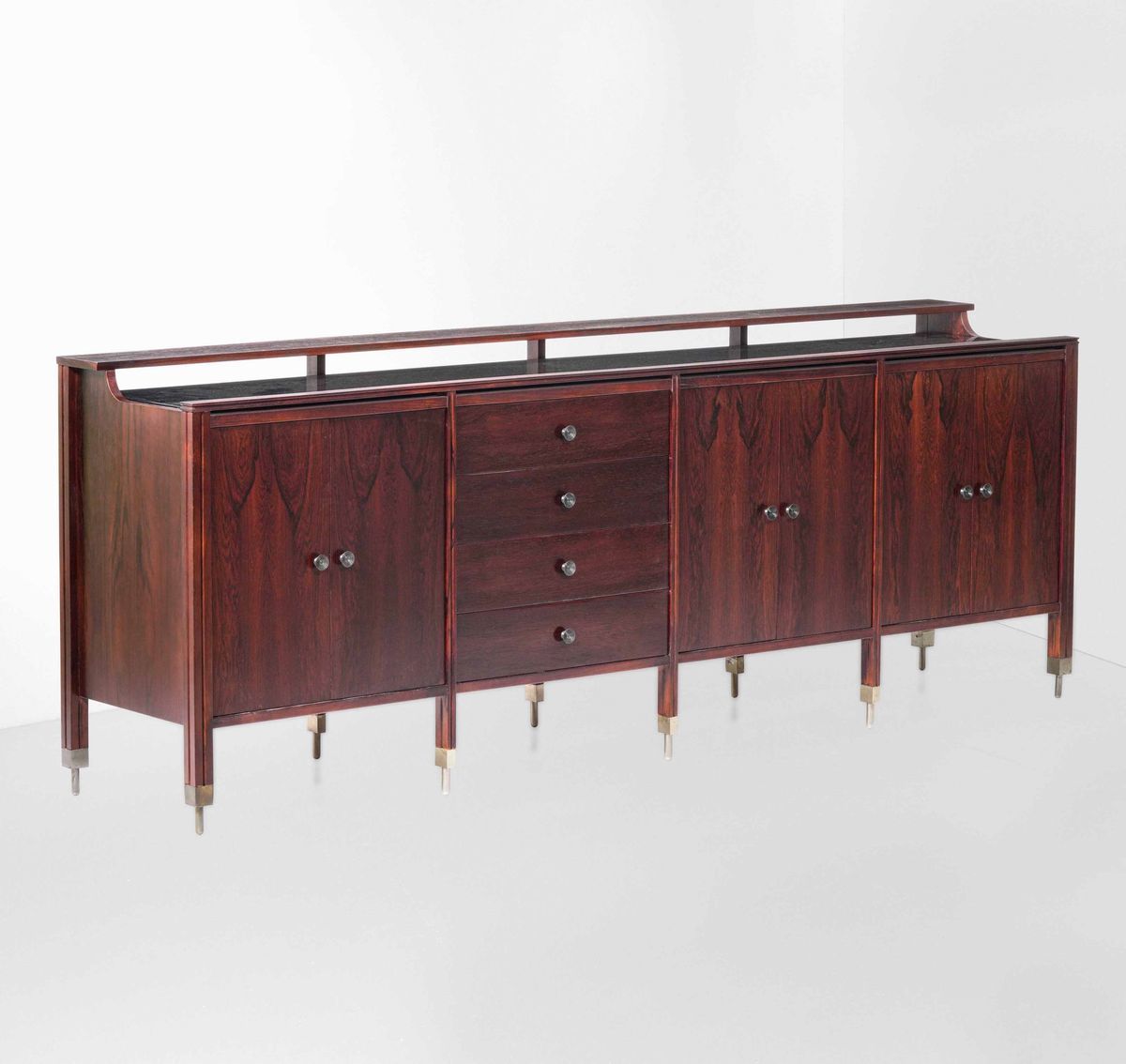 Mobile contenitore con struttura in legno e dettagli in metallo. Sostegni con puntali in ottone nichelato.
