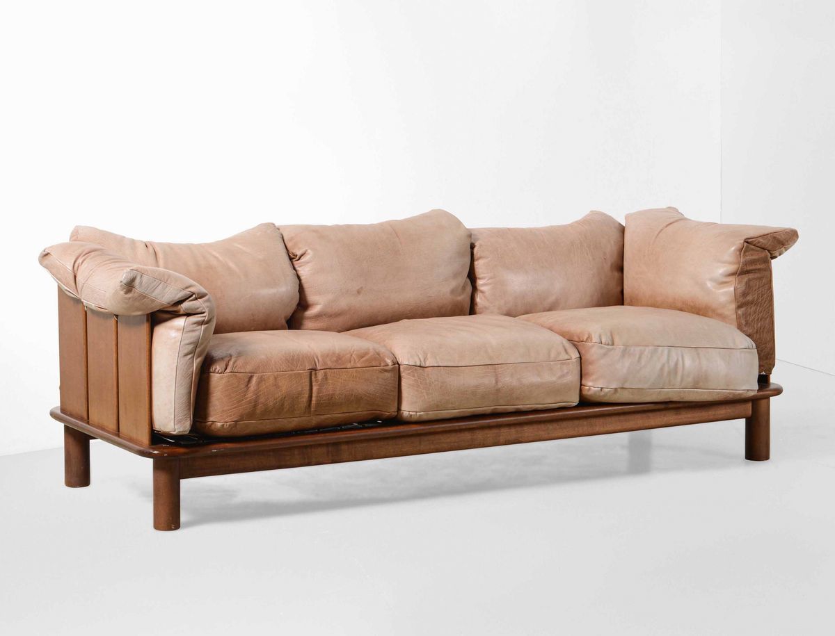 Divano mod. Pitti con struttura e sostegni in legno e rivestimenti in pelle.
