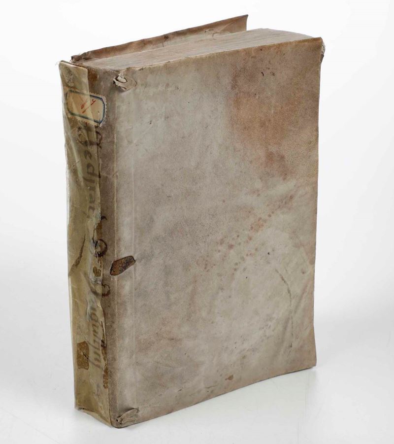 In-4°. Rilegatura in pergamena floscia antica con rottura al dorso parzialmente staccata. Capilettera rubricati in rosso e blu. Alcune grandi iniziali miniate, come pure miniata è la bordura di carta a2. Carta a2, smarginata e mancante dell'intera porzione di carta bianca di margine. Bruniture e gore. 264 carte su 276. Manca la prima carta bianca, le ultime quattro carte (segnatura V4) e alcune carte interne.
