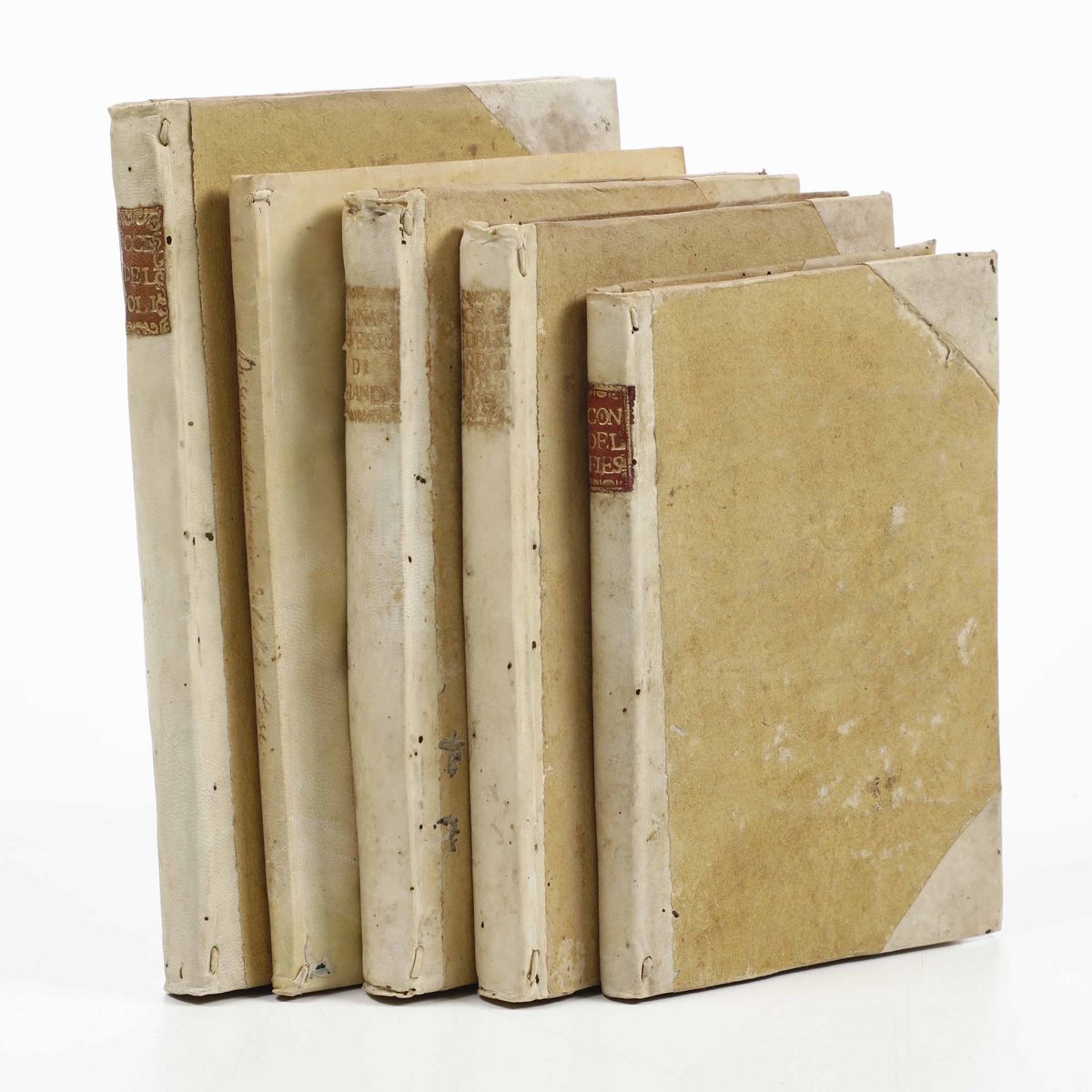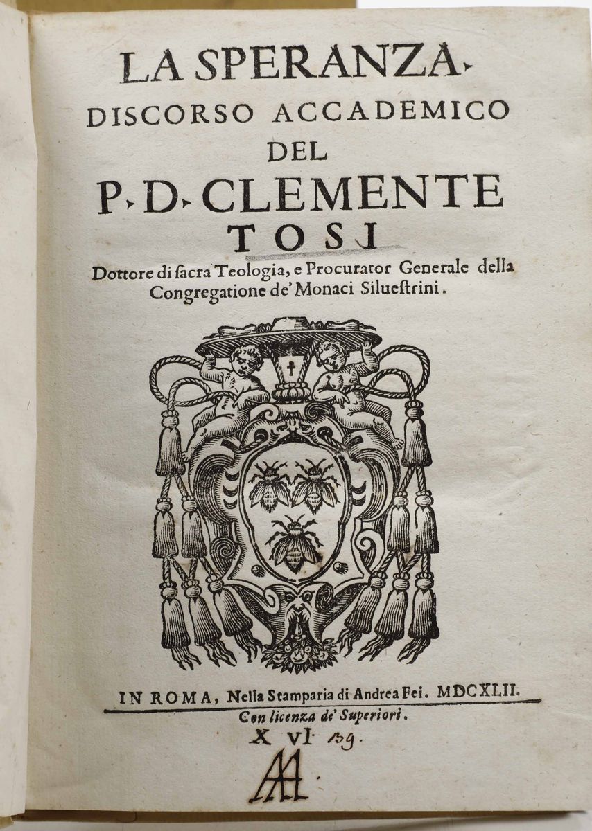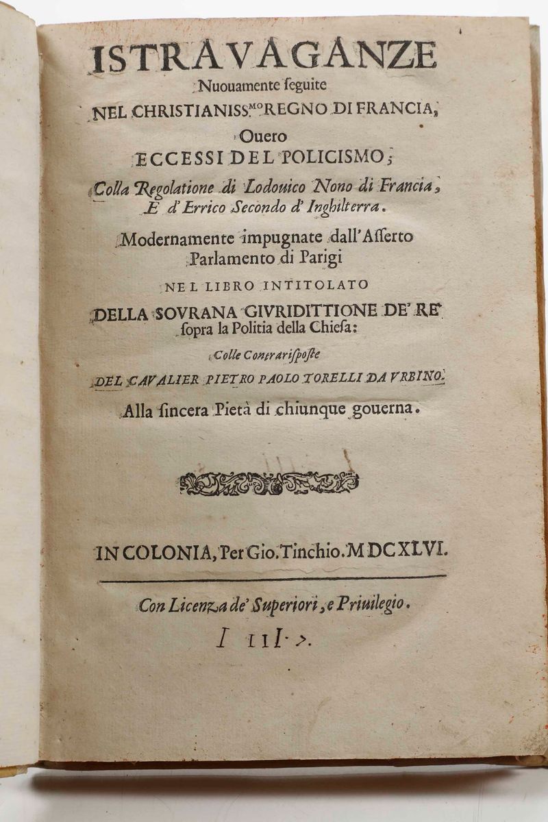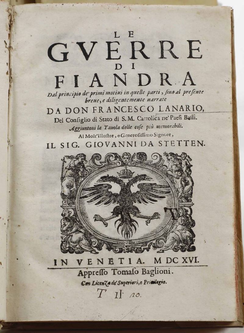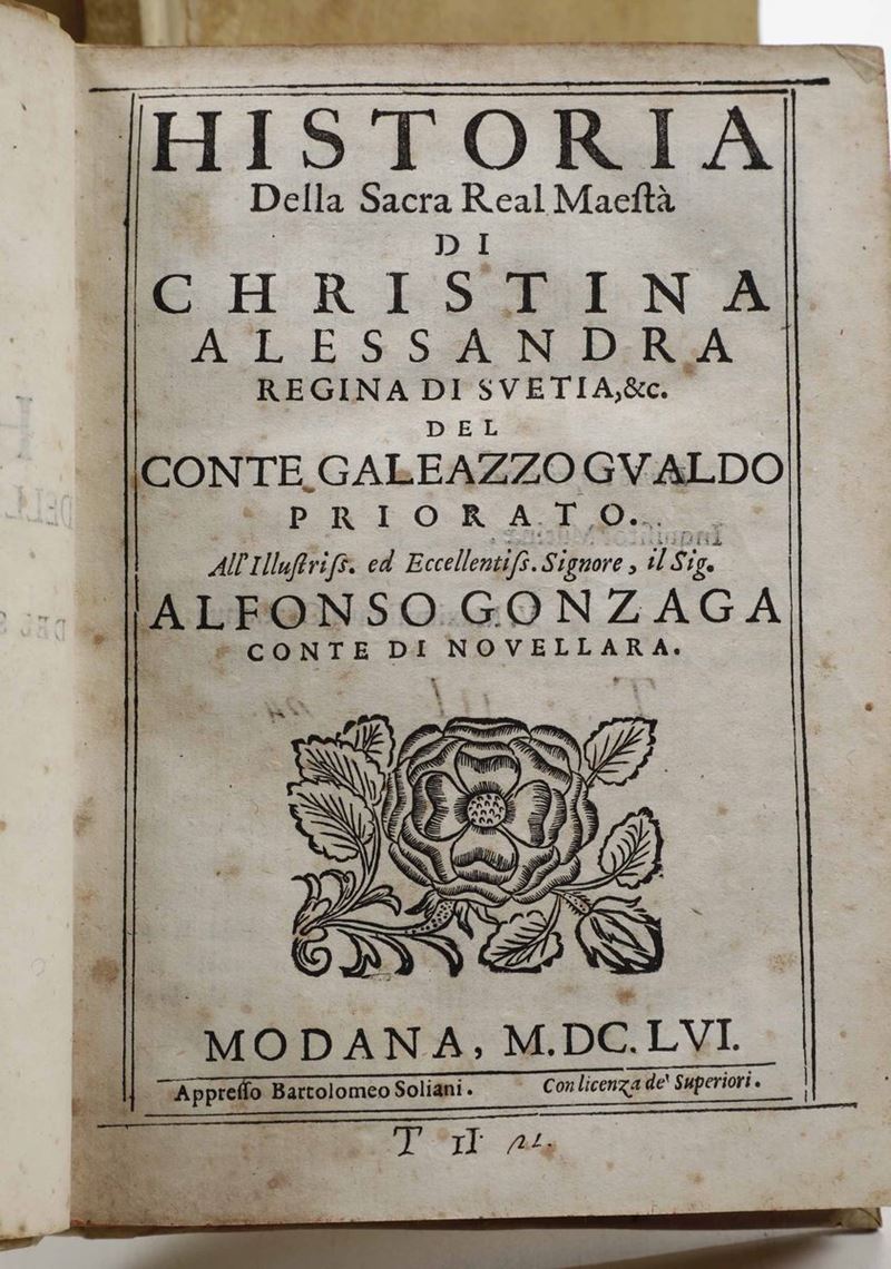In-4°. Rilegatura coeva in mezza pergamena e punte. Tagli decorati a spruzzo in rosso. Fori di tarlo che interessano le ultime carte. Al lotto si aggiungono: Gualdo Galeazzo - Historia della sacra real maestà di Christina Alessandra regina di Svetia...Modena, 1656. / Francesco Lanario - Le Guerre di Fiandra...In Venetia, Appresso Tomaso Baglioni, 1616. / Clemente Tosi - La speranza. Discorso accademico del P.D. Clemente Tosi...In Roma, nella Stamperia di Andrea Fei, 1642. / Pietro Paolo Torelli da Urbino - Istravaganze nuovamente seguite nel christianissimo Regno di Francia...In Colonia, Per Gio. Tinchio, 1646.