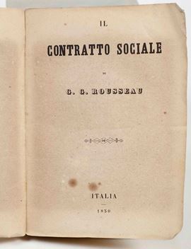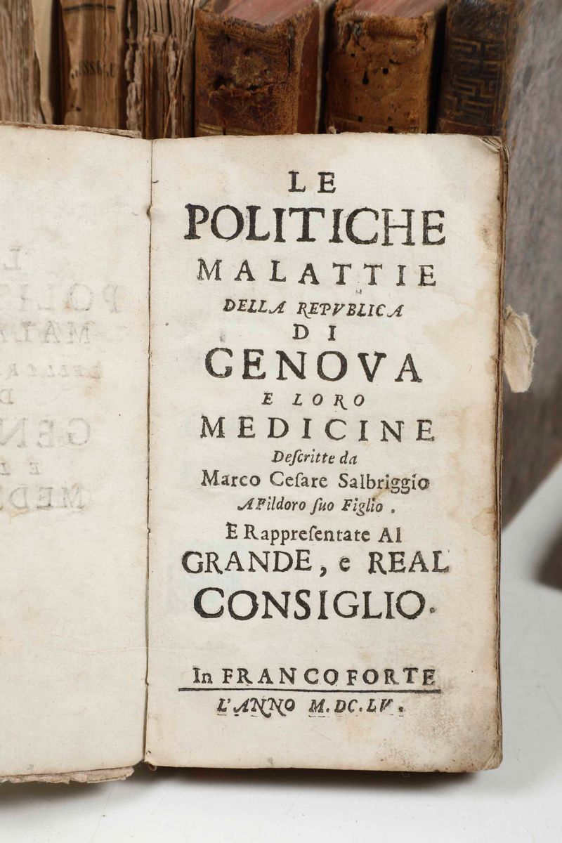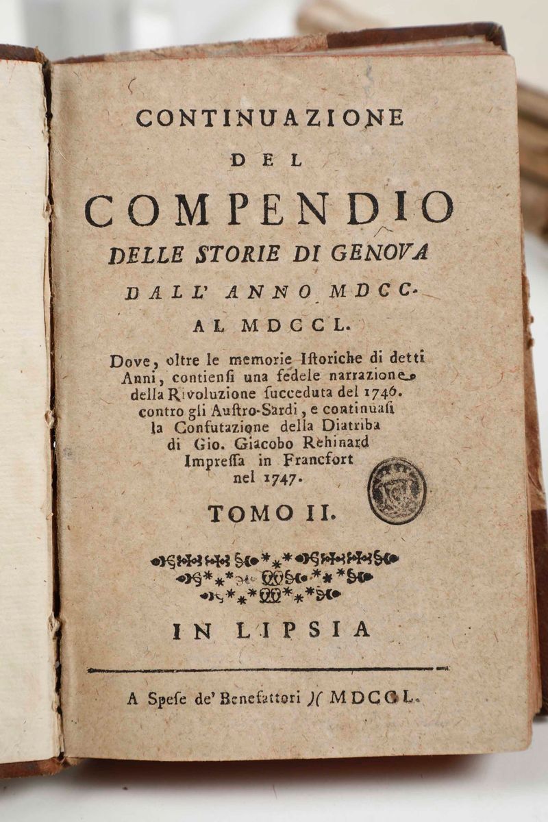 Si uniscono al lotto: Verità essaminata a favore del popolo (Genova, 1628, Anselmo Giovanni Antonio). / Francesco Maria Accinelli - Continuazione del compendio delle storie di Genova, Lypsia, 1750, 2 tomi. / Costituzione del popolo ligure, Genova, nella stamperia francese e italiana, anno II della Repubblica ligure. / Marco Cesare Salbriggio - Le politiche e le malattie della Repubblica di Genova, in Francoforte, 1655. / Gio Domenico Zenone-Giuseppe Pacchiaroti - Della difesa della sincerità del successo, in Bassano, Remondini (1710). / Rousseau - Il contratto sociale, Italia, 1850.