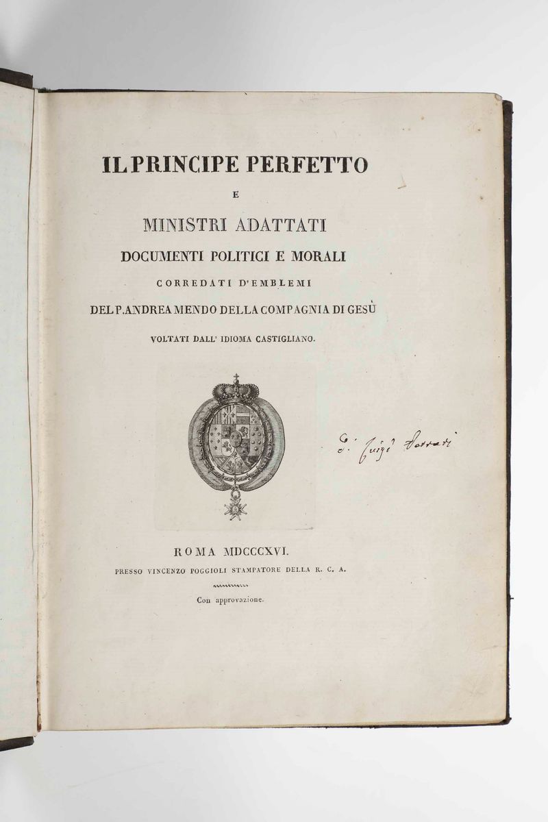 Andrea Mendo Il principe perfetto e ministri adattati. Documenti politici e morali corredati d'emblemi... Voltati dall'idioma castigliano... Roma presso Vincenzo Poggioli 1816