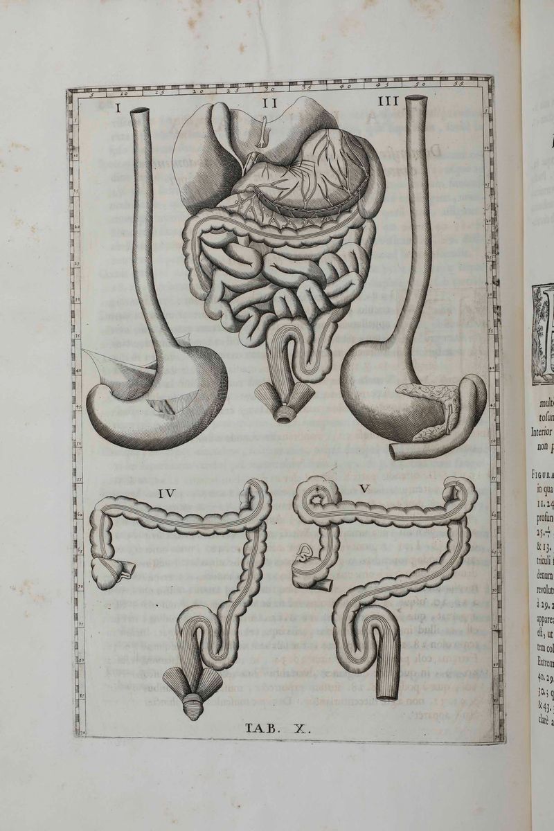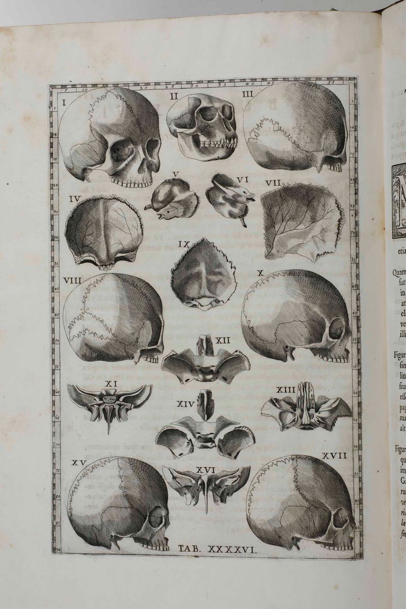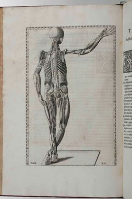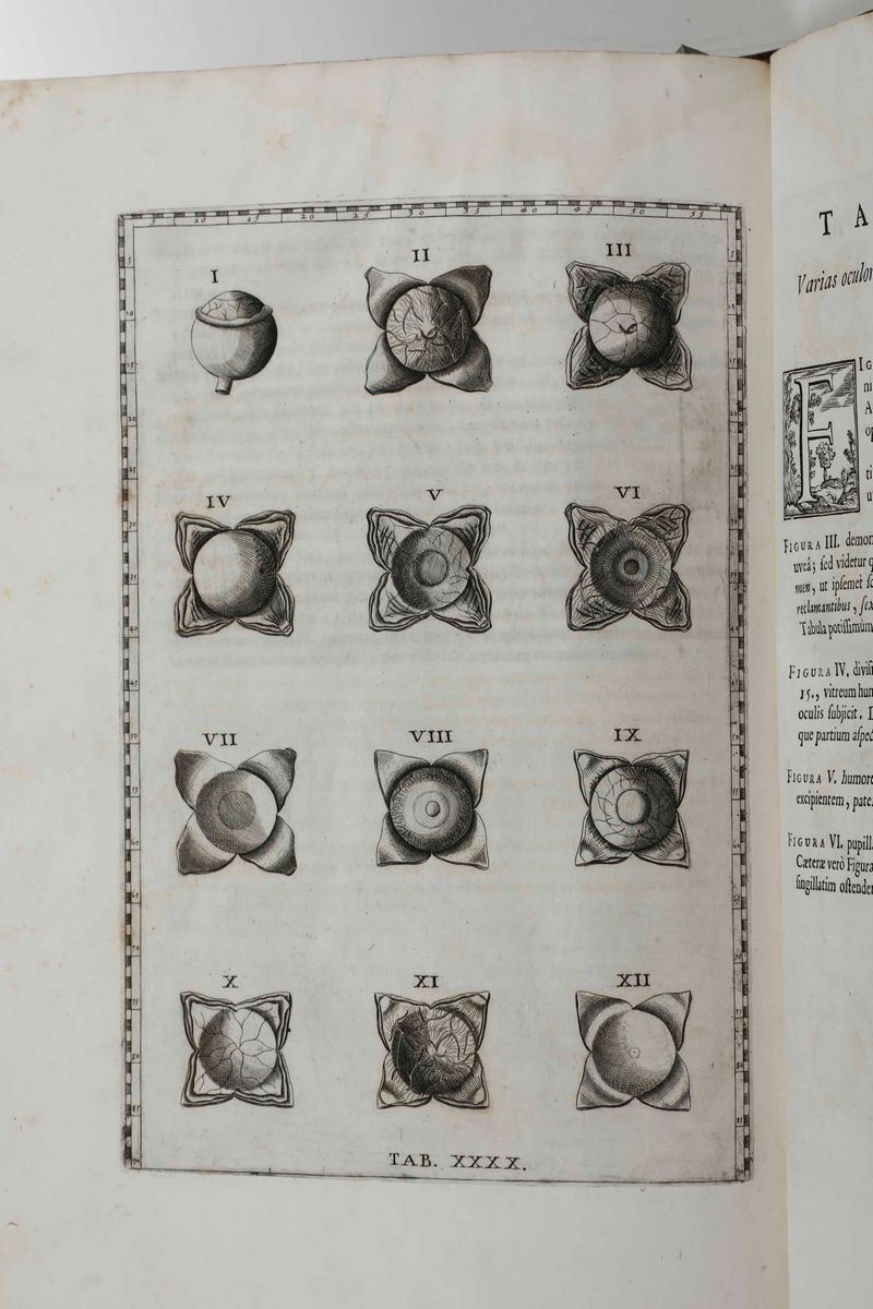 In-folio. XLIV+ 115+(13) pp. 47 tavole anatomiche calcografiche, inserite fuori testo. Bella rilegatura coeva in marocchino rosso alle armi di Papa Clemente XI. Tagli decorati a spruzzo. Alcune fioriture, peraltro bellissimo esemplare genuino a grandi margini