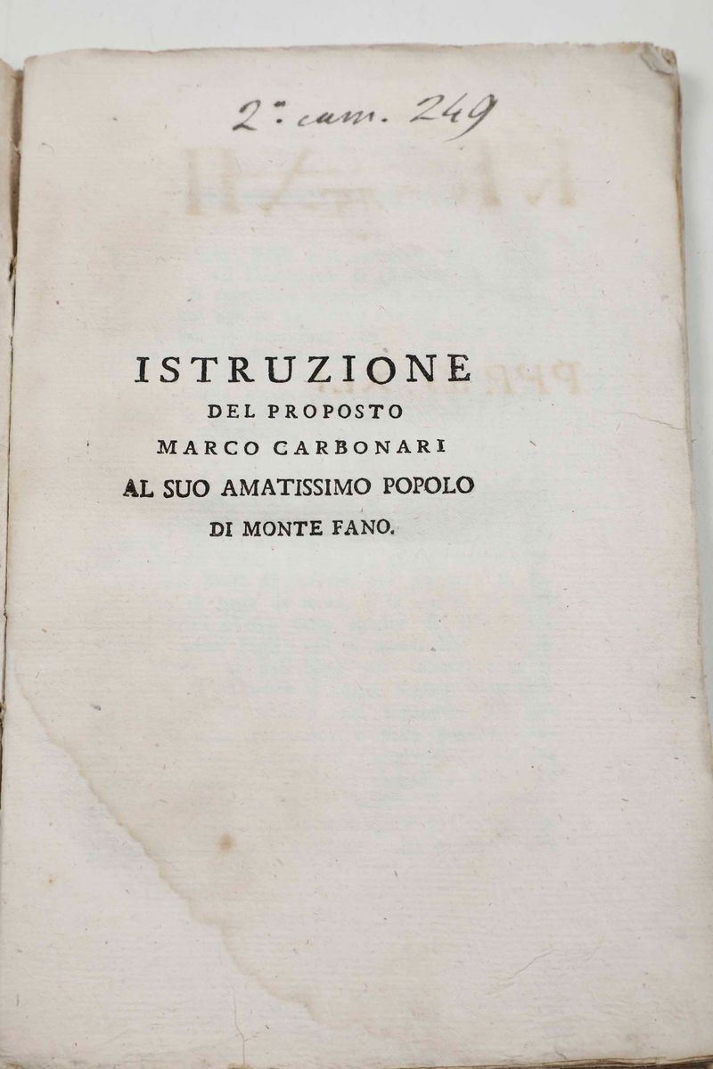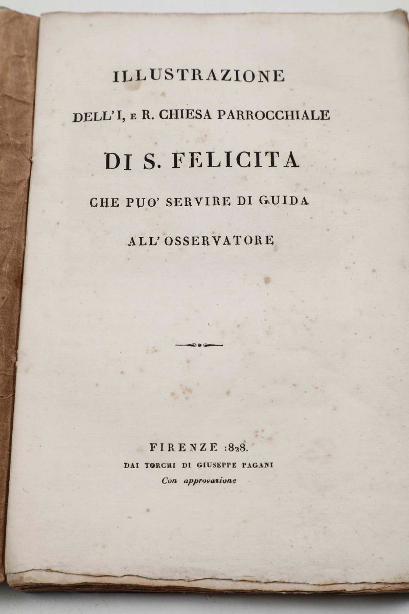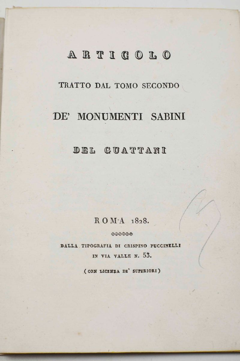 In-8°. Rilegatura coeva in mezzo marocchino rosso a grana lunga. Invio autografo dell'autore alla carta di controguardia. Al lotto si aggiungono: Giuseppe Antonio Guattani - De’ monumenti sabini, Roma, dalla Tipografia di Crispino Puccinelli, 1828. / Marco Carbonari - Istruzione del proposto Marco Carbonari al suo amatissimo popolo di Monte Fano, Macerata, presso Bartolomeo Capitani, Anno VII Rebup. /Alcuni sintomi importanti del moderno contagio per uso degl’abitanti di campagna. Lettera ad uno studente delle provincie pontificie, Firenze, presso Nicola Fabbrini, 1832. / Illustrazione dell’i, e R. Chiesa parrocchiale di S. Felicita che può servire di guida all’osservatore, Firenze, dai Torchi di Giuseppe Pagani, 1828. / Una seconda copia di Bernardino Caccia - Del metodo curativo della tigna e della scabbia tenuto nel pio stabilimento della casa d’industria...Roma, Per Giuseppe Brancadoro E C., 1833.