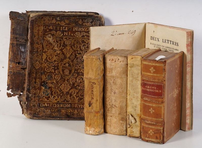 Si aggiungono al lotto: Athenagoras Philosophe Athenien - Du vray et parfaict amour, a Paris, chez Michel sonnius, 1599. / Ovidio - Epistole di Ovidio di Remigio Fiorentino, in Vinegia, appresso Gabriel Giolito de Ferrari. / Il Petrarca nuovamente ridotta la sua vera lettione... in Venezia, appresso Barezzo Barezzi, 1592. / Deux Lettres...sur la Rivolution de France. / Una rilegatura vuota cinquecentesca in quarto vuota.