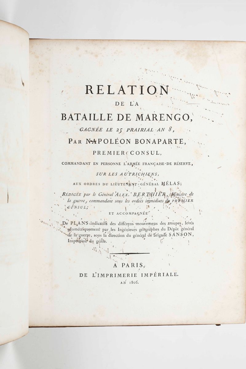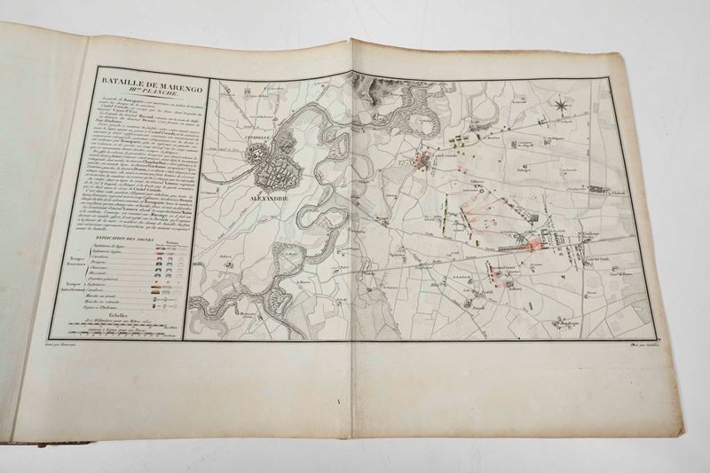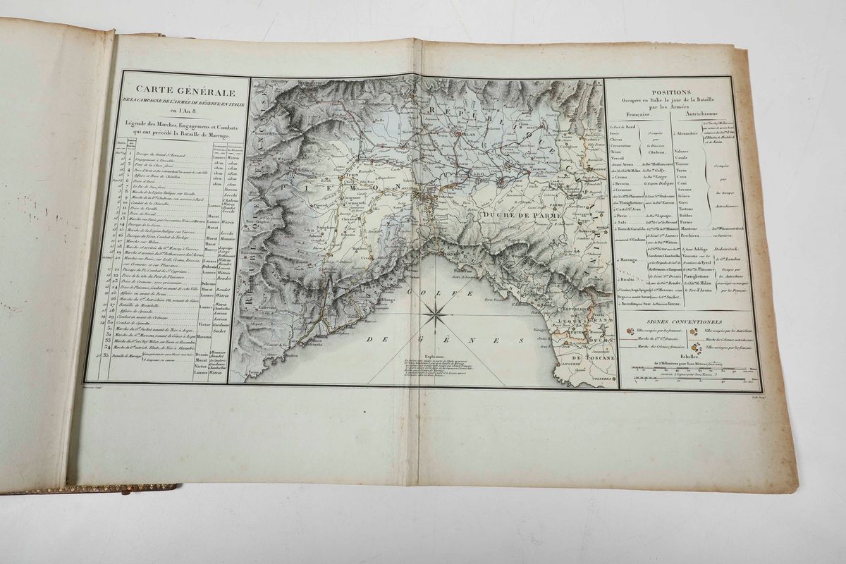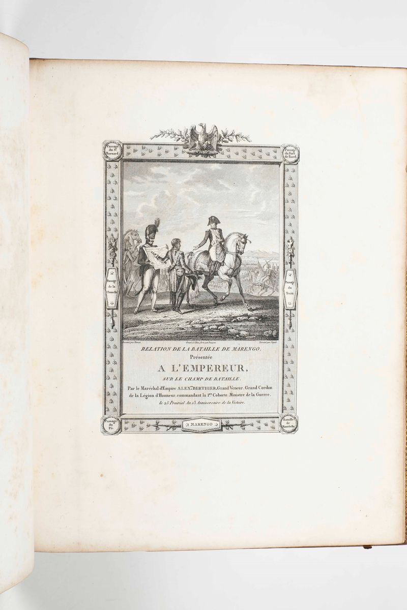 In-4°. Rilegatura coeva in pelle oliva alle armi napoleoniche impresse in oro al centro dei piatti, inquadrati da elegante bordura. Antiporta disegnata da Vernet, manca la tavola sinottica ripiegata come in tutti gli esemplari con questa rilegatura. Sono contenute un ritratto di Napoleone, una carta generale della Campania dell'armata di riserva in Italia. quattro tavole ripiegate sulle posizioni dell'armata, una veduta dellaa battaglia disegnata dal Bagetti. Seconda edizione, prima in grande formato.