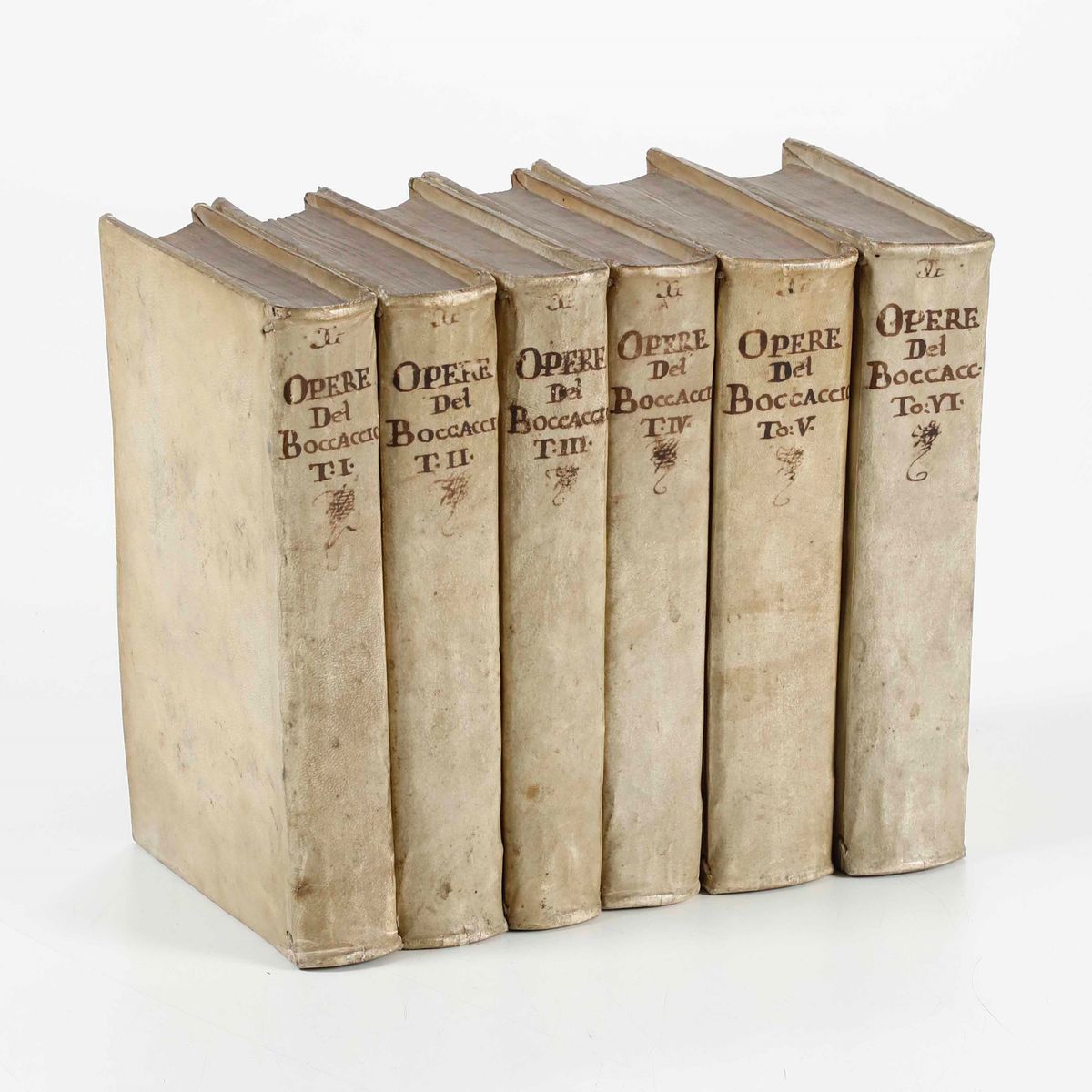 In-8°. Sei tomi. Rilegature coeve in piena pergamena. Piede dei frontespizi ritagliato anticamente per occultare firma di proprietà. Bruniture e altri difetti.