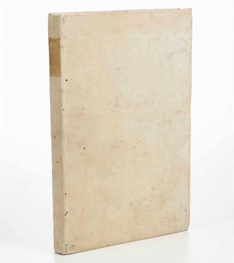 In-folio.(302x205 mm).(122) carte non numerate. Rilegatura antica in piena pergamena rigida. Antica segnatura manoscritta al frontespizio. Macchia di inchiostro non deturpante, a carta *2 recto. Gora marginale che interessa le ultime 20 carte senza mai toccare il testo. Alcuni fori di tarlo a spillo, lontani dal testo che interessano poche carte. Bellissimo esemplare, genuino e molto marginoso. Edizione originale assai rara. Grande marca tipografica aldina al frontespizio, ripetuta al verso dell'ultima carta.