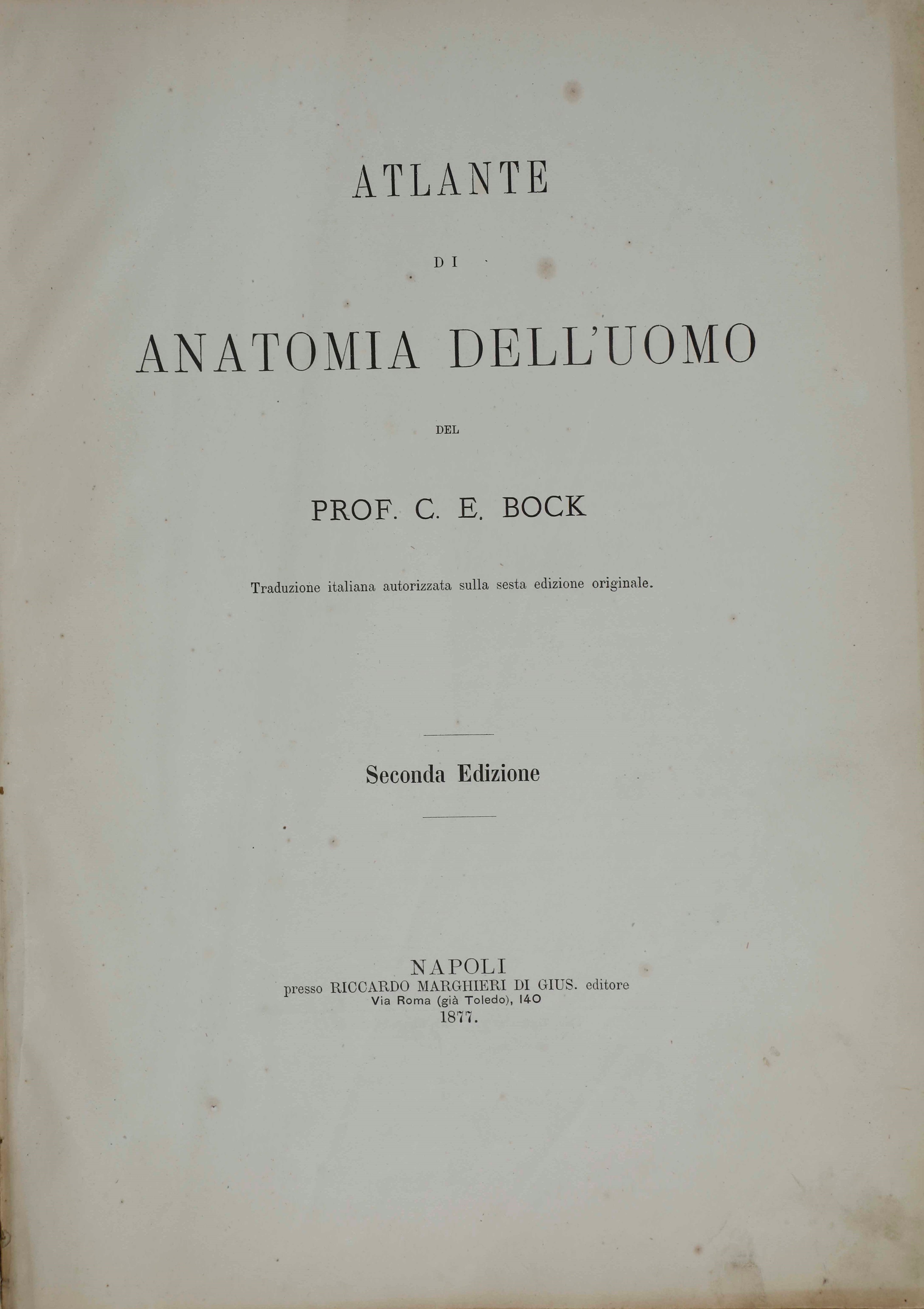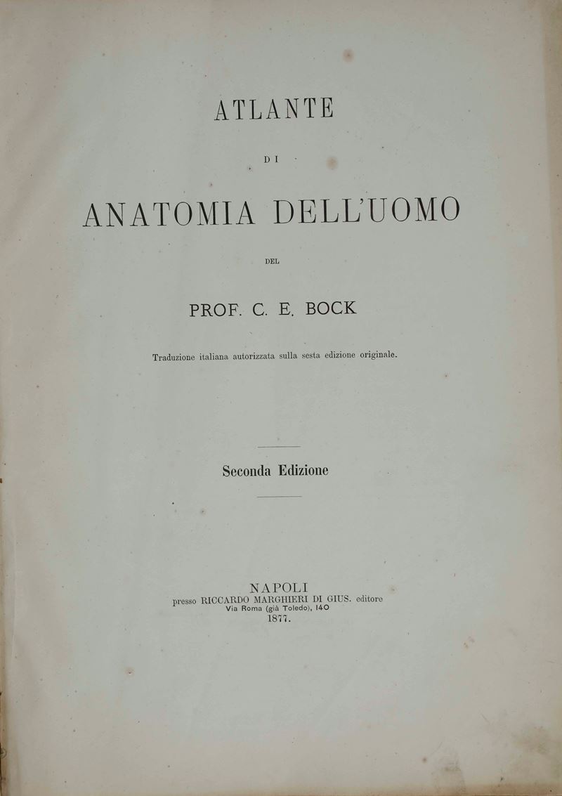 C.E. Bock Atlanti di anatomia dell'uomo. Traduzione italiana autorizzata sulla sesta edizione originale. Seconda edizione. Napoli, presso Riccardo Marghieri 1877