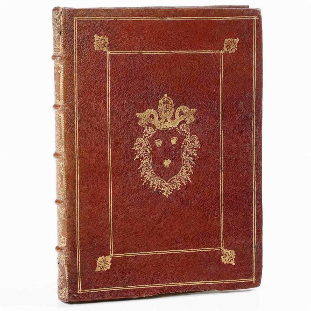 In-folio. Legatura coeva in piena pelle rossa con fregi in oro al dorso e armi papali di Innocenzo XII ai due piatti. Tagli dorati. Abrasione al piede della legatura.