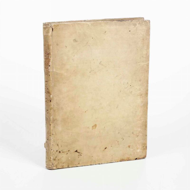In-4°. Legatura coeva in pergamena rigida. Ex libris di diversa fattura al frontespizio. Fori di tarlo alle prime 4 carte che non interessa il testo. Buon esemplare