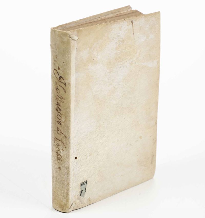 In-8°. Rilegatura coeva in piena pergamena floscia. Bel frontespizio stampato in rosso e nero. Ottimo esemplare genuino di questo manuale dedicato al maestro di casa, con riferimenti alla cucina, alle bevande, alla presentazione e alla preparazione dei cibi.