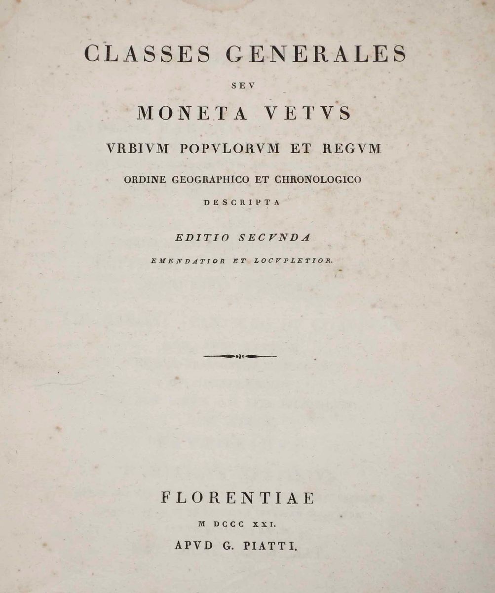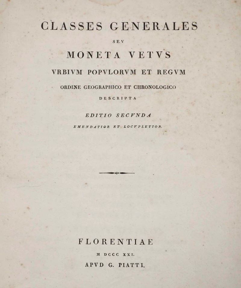 Al lotto si aggiungono: Minervini Giulio - Saggio di osservazioni numismatiche, Napoli, dallo stabilimento tipografico di Giuseppe Cataneo, 1856. / Classes Generales sue moneta vetus urbia populorum et regnum..., Florentiae, apud G. Piatti, 1821.