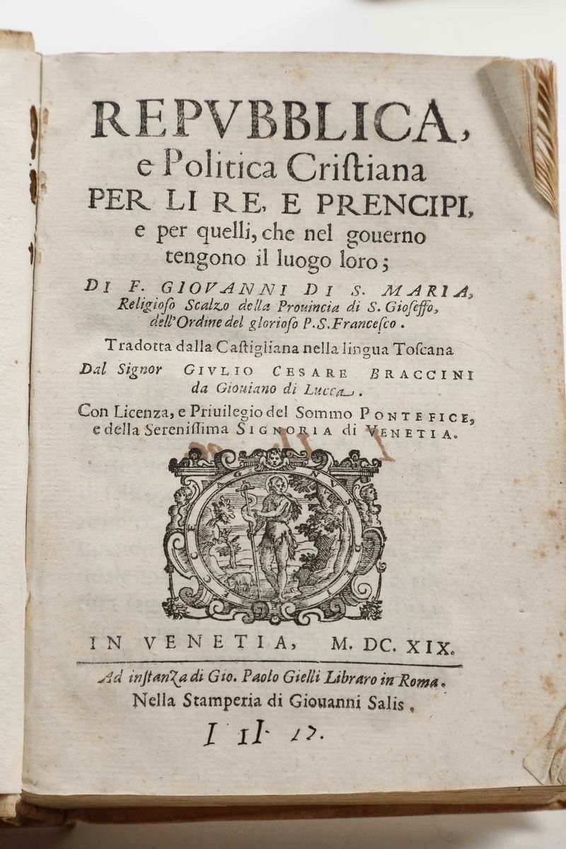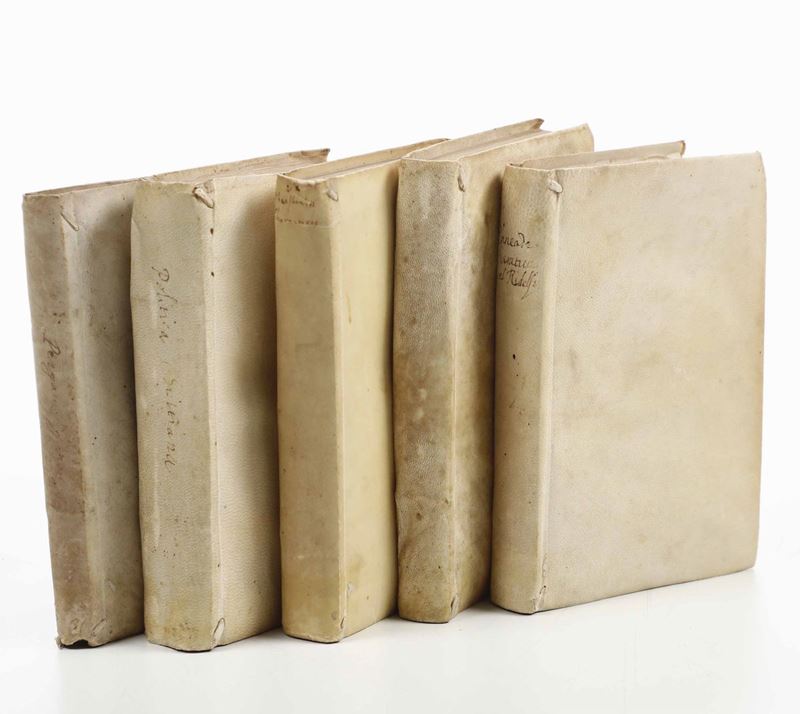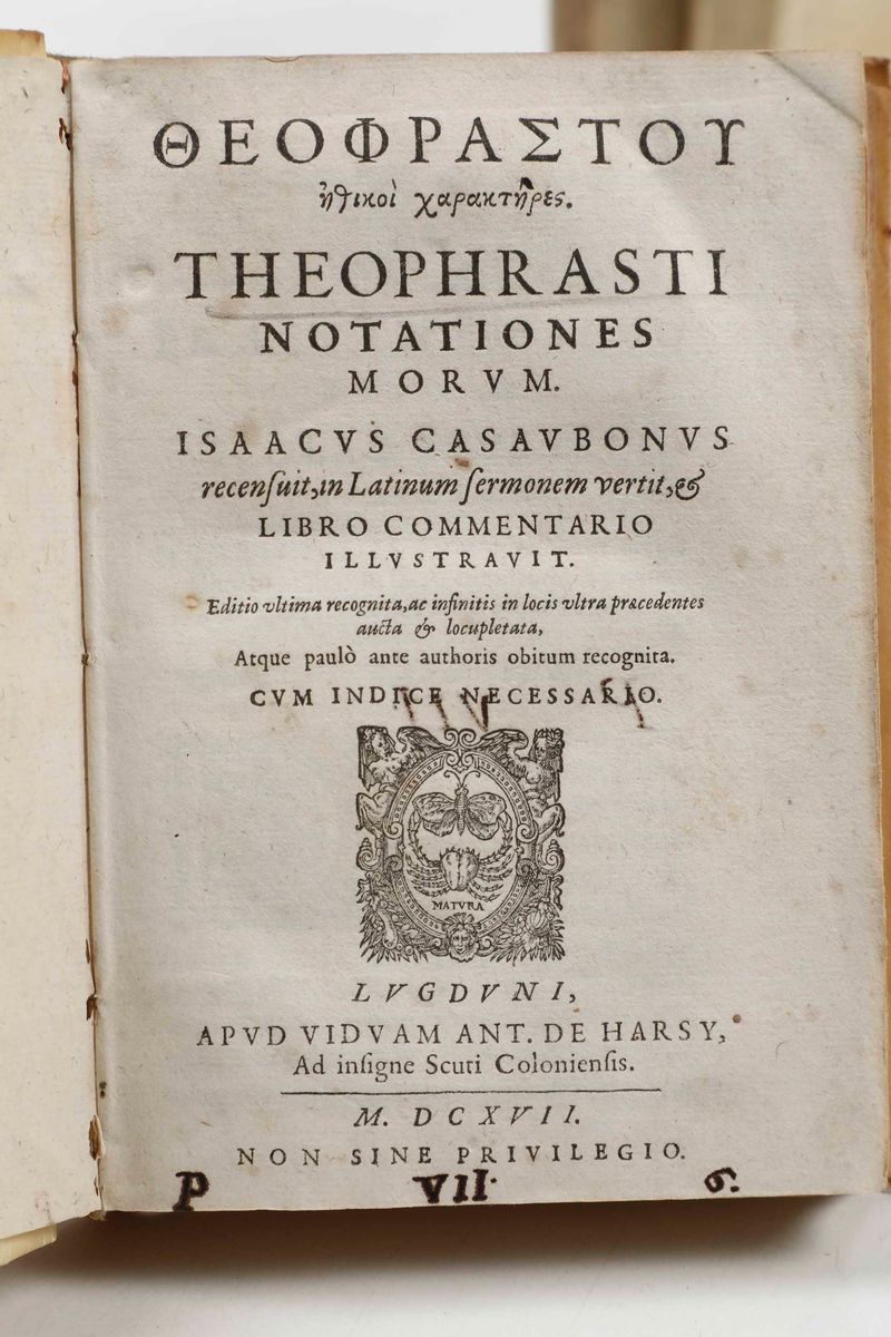 Al lotto si aggiungono: Theophrastus - Theophrasti Notationes morum...Lugduni, Apud Viduam Ant. de Harsy, 1617. / Latrobio (Giovan Pietro Giussani) - Il Brancaleone...In Venetia, Presso Gio. e Varisco Varischi Fratelli, 1617. / Giovanni di S. Maria - Republica e Politica Cristiana per li Re, e Principi...In Venetia, nella Stamperia di Giovanni Salis, 1619. / Giacomo Pergamini - Trattato della lingua, in Venetia, Appresso i Giunti, 1636.