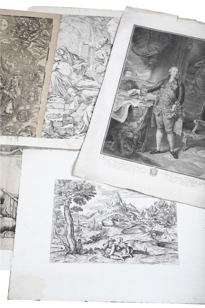 Al lotto si aggiungono altre sette incisioni di grande formato di soggetto religioso e mitologico