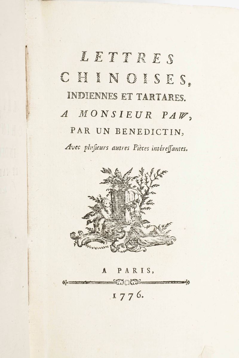 Al lotto si uniscono: Lettres chinoises, a Paris, 1776. / Washington Irving - Storia della vita e dei viaggi di Cristoforo Colombo, Genova, dalla Tipografia dei Fratelli Pagano, 1828 (volume III)