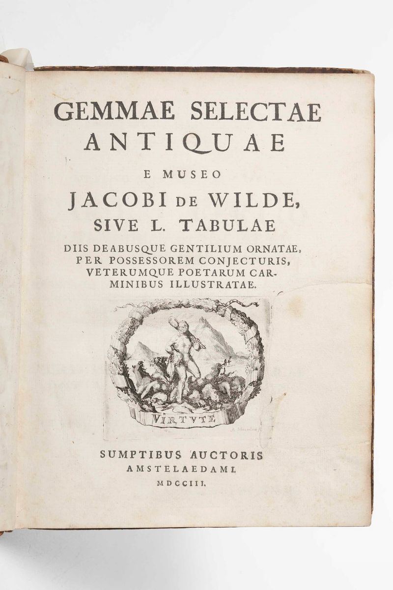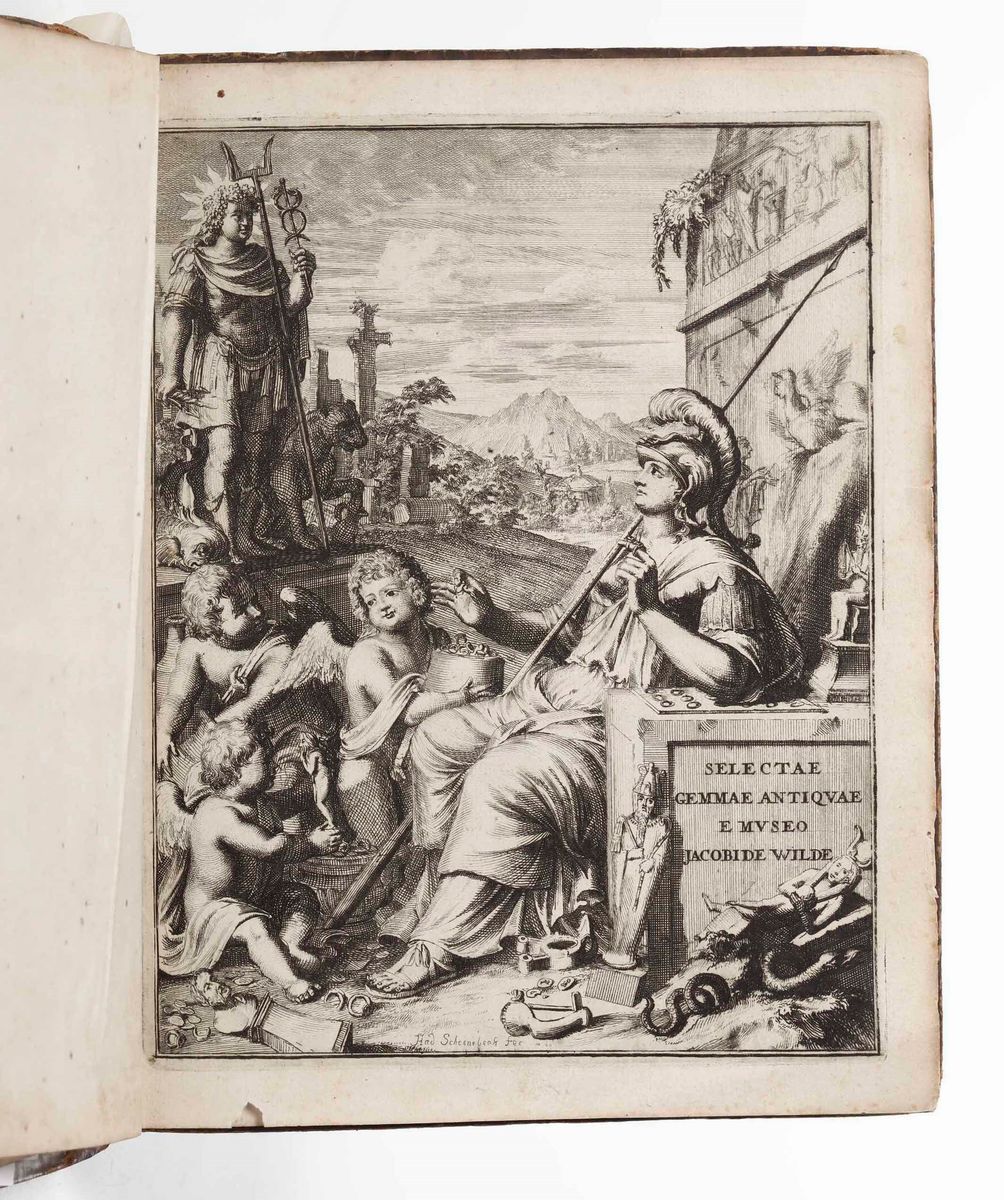 In-4°. Legatura coeva in piena pelle. Piatto anteriore staccato. Mancanza restaurata al frontespizio. Antiporta allegorica incisa in rame e 50 tavole a piena pagina, ad illustrare antiche gemme.