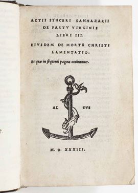 Actii synceri sannazarii de partu virginis...Venezia, in Aedibus aeredi Aldi e Andrea soceri, 1533.