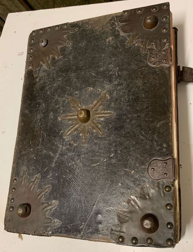 In-folio. Importante legatura monastica in stile antiquato. Cantonali metallici e tracce di fibbie di chiusura. Stampato in rosso e nero con parte addizionale manoscritta in fine.