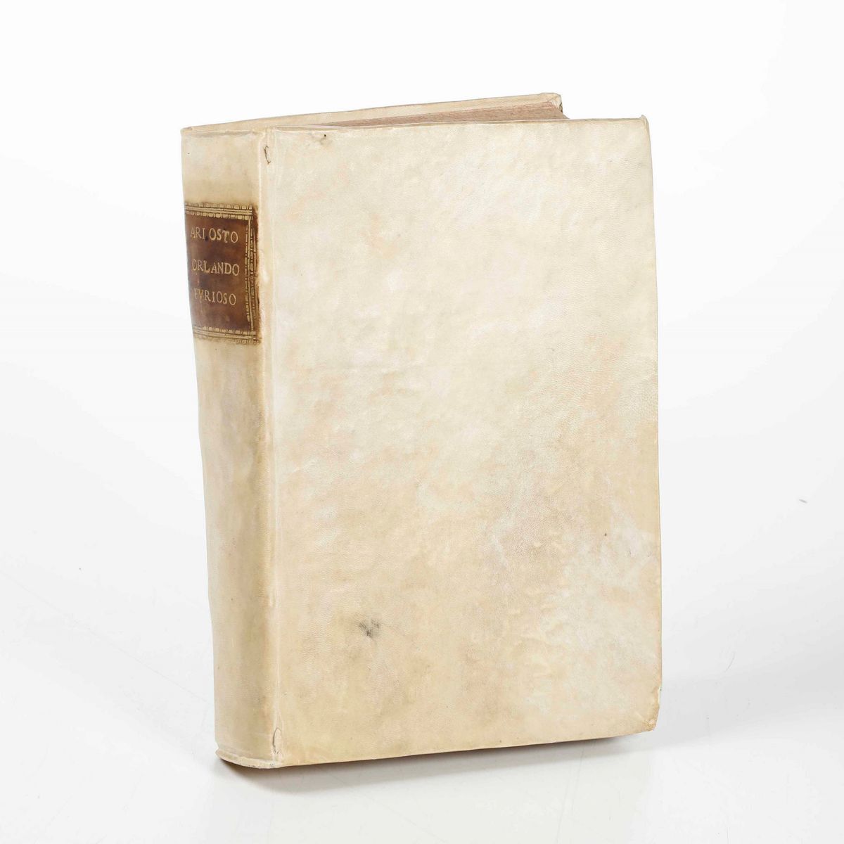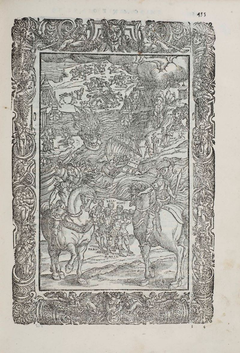 In-4°. Rilegatura in piena pergamena del secolo XVIII. 51 belle tavole xilografiche a piena pagina da disegni di Dosso Dossi. Bell’esemplare genuino.