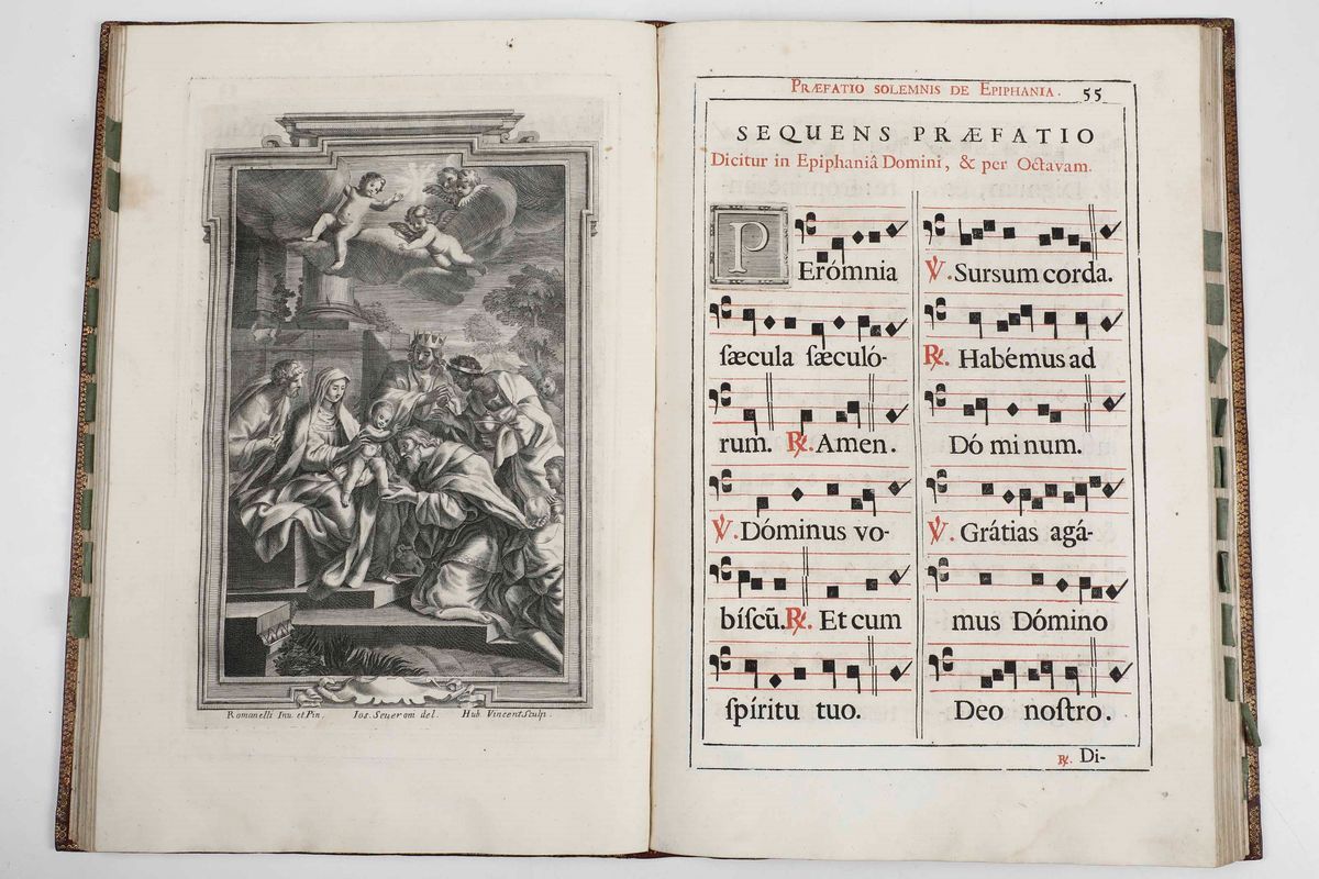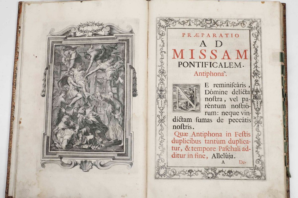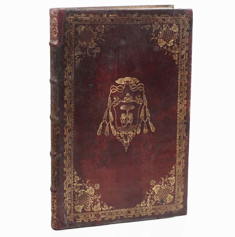 In-folio. Bellissima rilegatura alle armi in marocchino rosso con fregi in oro al dorso e ai piatti. Armi vescovili ai due piatti (Arcivescovo Angelo Franceschi). Bell’esemplare stampato in rosso e nero adorno di grandi incisioni a piena pagina di soggetto religioso.