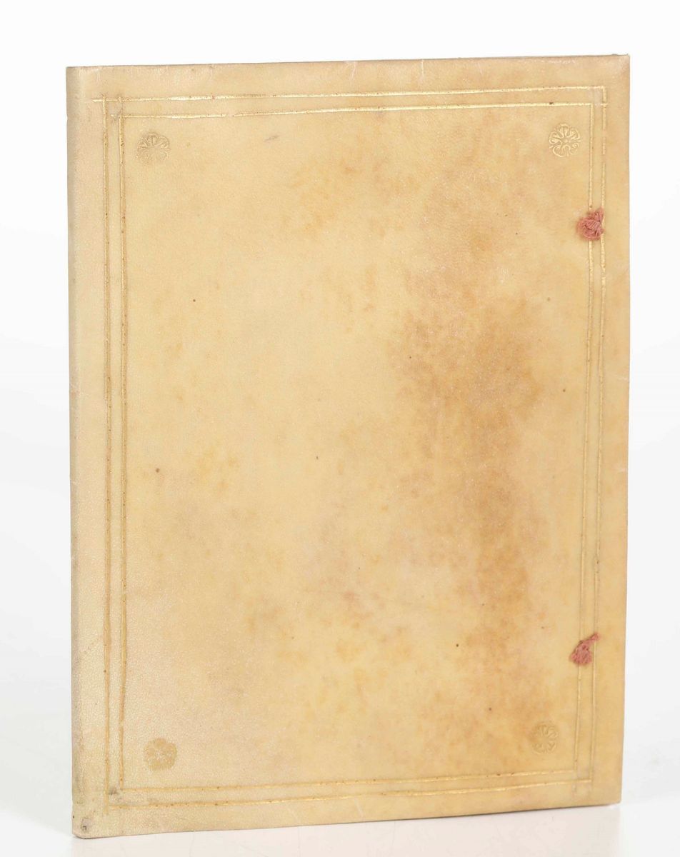In-4°. Rilegatura coeva in pergamena floscia. 32 pagine. In Iccu SBN è registrata però una sola edizione difforme rispetto alla nostra, composta da 47 pagine.