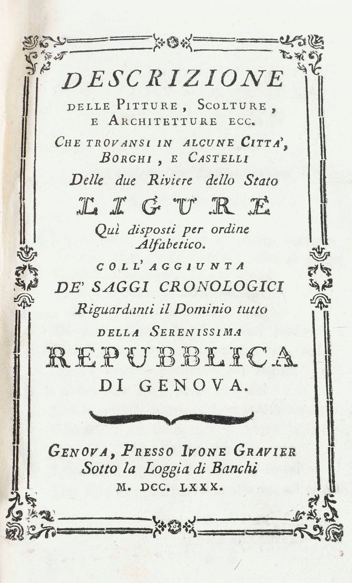 Descrizione delle pitture, scolture et architetture ecc. che trovansi in alcune città, borgi e castelli delle due Riviere dello Stato Ligure, Genova, Ivone Gravier, 1780