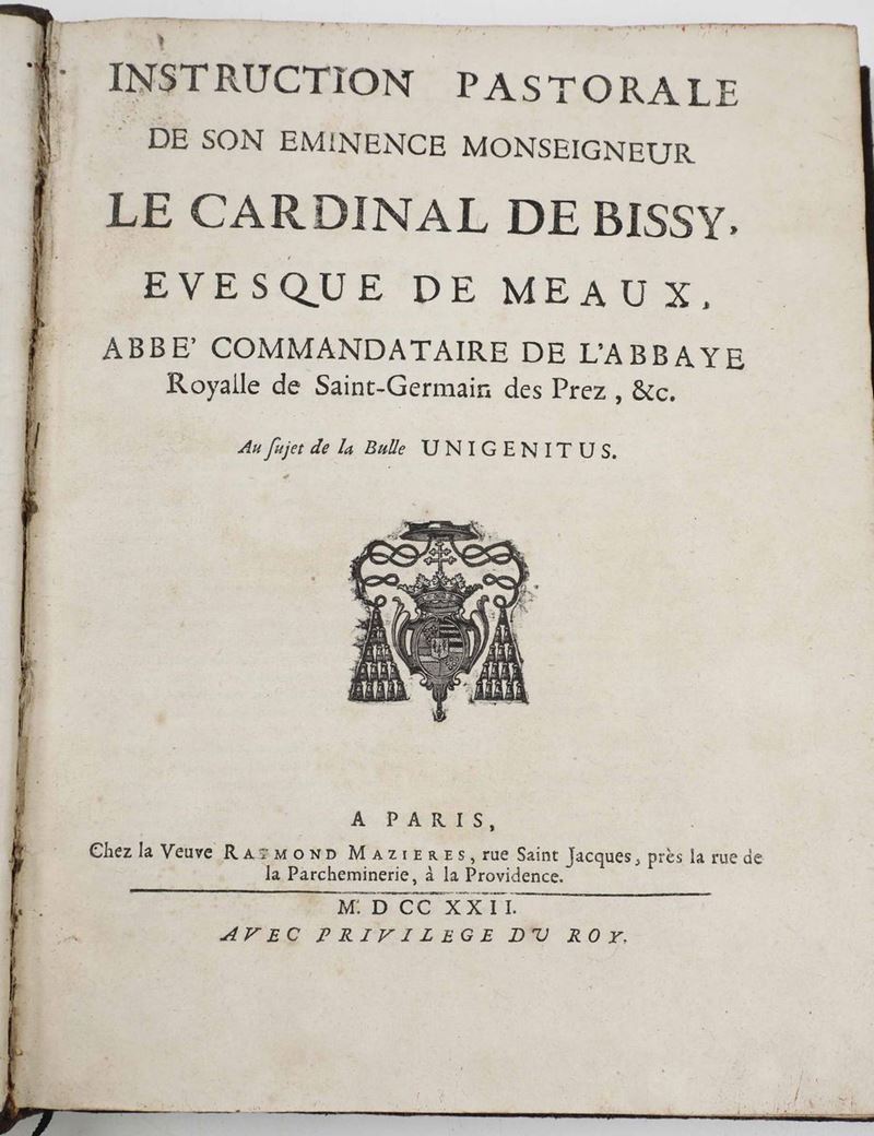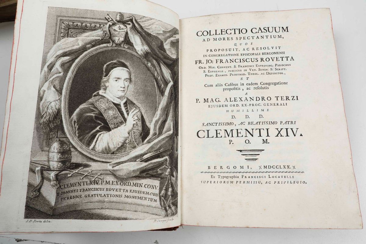 In-4°. Rilegatura coeva in piena pergamena floscia. Il nostro esemplare presenta alcune carte staccate e il frontespizio, che risulta mancante, è stato sostituito anticamente, con un frontespizio di una edizione successiva (Venezia 1564). Al lotto si aggiungono: Antonio Valsecchi - La verità della Chiesa Cattolica, Appresso Niccolo Bettinelli, Padova 1787. / Istruction pastorale del Cardinal De Bissy, A Paris, Chez la Veuve Raymond Mazieres, 1722. / Francesco Rovetta - Collectio Casuum ad mores spectantium...Bergamo, Ex Typographia Francisci Locatelli, 1770. / Ignazio Ludovico Bianchi - Ragguaglio della vita del beato Giovanni Marinoni, In Venezia, Presso Guglielmo Zerletti, 1763.