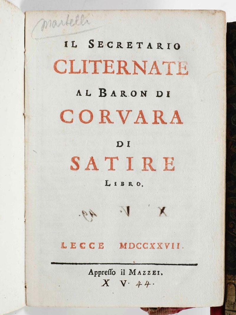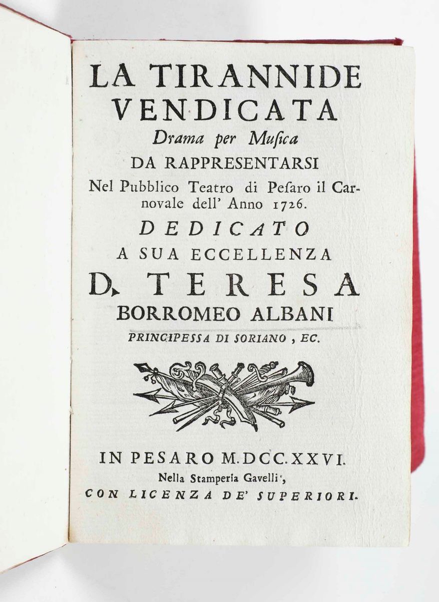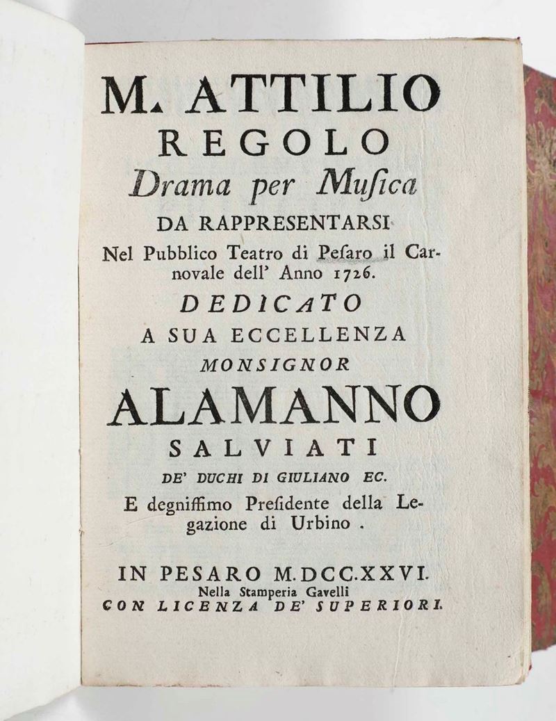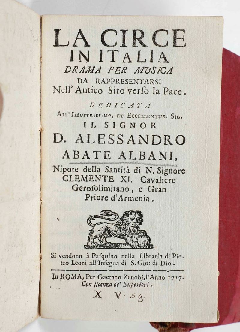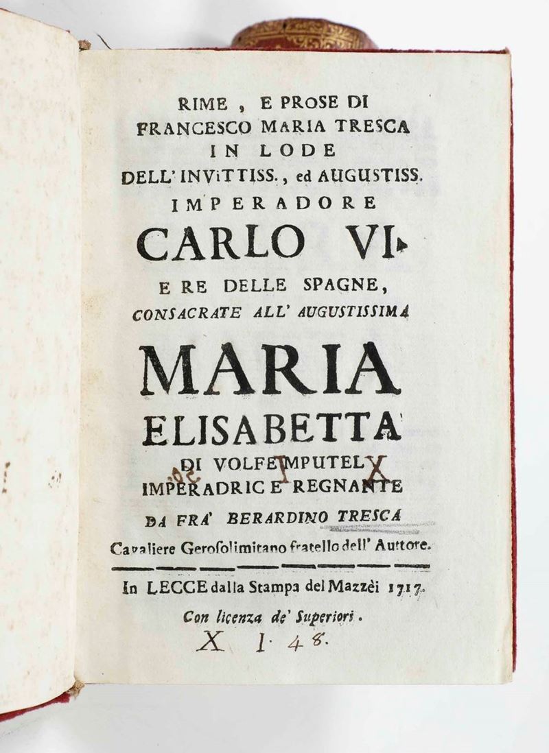 Si uniscono al lotto: Francesco Maria Tresca - Rime e prose in lode dell’imperatore Carlo VI, in Lecce, dalla stampa del Mazzei, 1717. / E altre 6 opere, per lo più di carattere teatrale e musicale (libretti d’opera)
