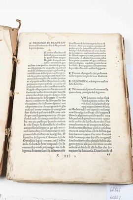 In-folio. 77 carte su 78. Manca a1, con titolo e vignetta silografica. Molte carte staccate. Strappo ad f6 senza perdita di testo. Legatura monastica con piatti in legno. Tracci di fermagli. Fori di tarlo ed altri difetti.
