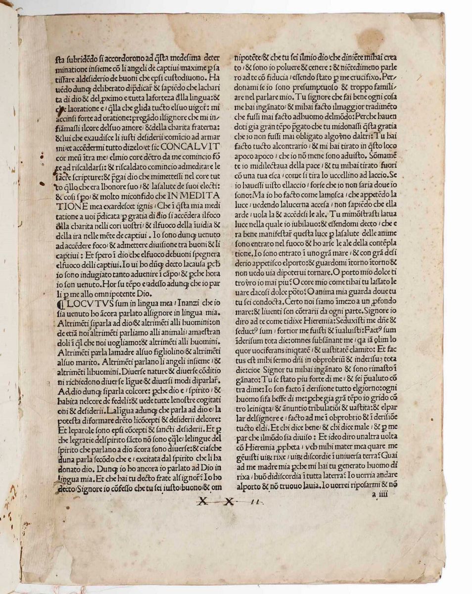 In-folio. Legatura in mezza pergamena e punte del secolo XVIII. Edizione delle prediche di Savonarola, purtroppo ampiamente scompleta sia all’inizio che in fine e mancante di alcune carte anche internamente. Proposto come curiosità tipografica. Alcune carte staccate. Gore e bruniture