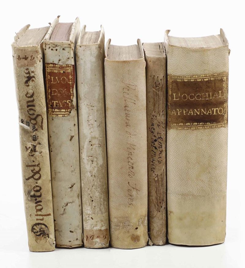 In-12°. Rilegatura coeva in piena pergamena floscia. Margini un poco corti, peraltro bell'esemplare. Al lotto si aggiunge: Nicola Villani - L'uccellatura di Vincenzo Foresi all'occhiale del cavaliere fra Tomaso Stigliani...In Venetia, appresso Antonio Pinelli, 1630. / Giovan Battista Marino - Il tempio, panegirico del Cavalier Marino, In Macerata, Appresso Pietro Saluioni, 1615. / / Francesco Sestini da Bibbiena - Il maestro di camera...In Firenze, 1623. / Gio. Pietro d’Alessandro - Dimostrazione di luoghi tolti, et imitati in più autori dal Sig. Torquato Tasso nel Goffredo, overo Gerusalemme Liberata...In Napoli, Appresso Costantino Vitale, 1604. / Gherardo Borgogni - La fonte del Diporto, Dialogo del Sig. Gherardo Borgogni...In Venetia, 1602.