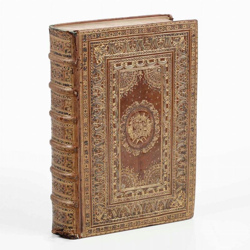 In-folio. Bellissima rilegatura coeva in piena pelle nocciola, lavorato ai piccoli ferri con ricchissime decorazioni in oro ai due piatti e al dorso. Armi nobiliari non identificate, in oro al centro dei due piatti. Tagli dorati. La legatura presenta piccole mancanze alle cuffie e alle cerniere. Bell'esemplare fresco e marginoso.