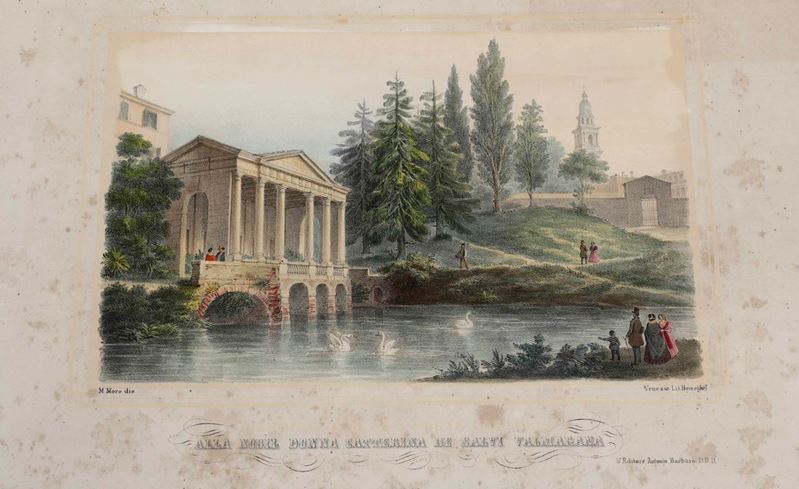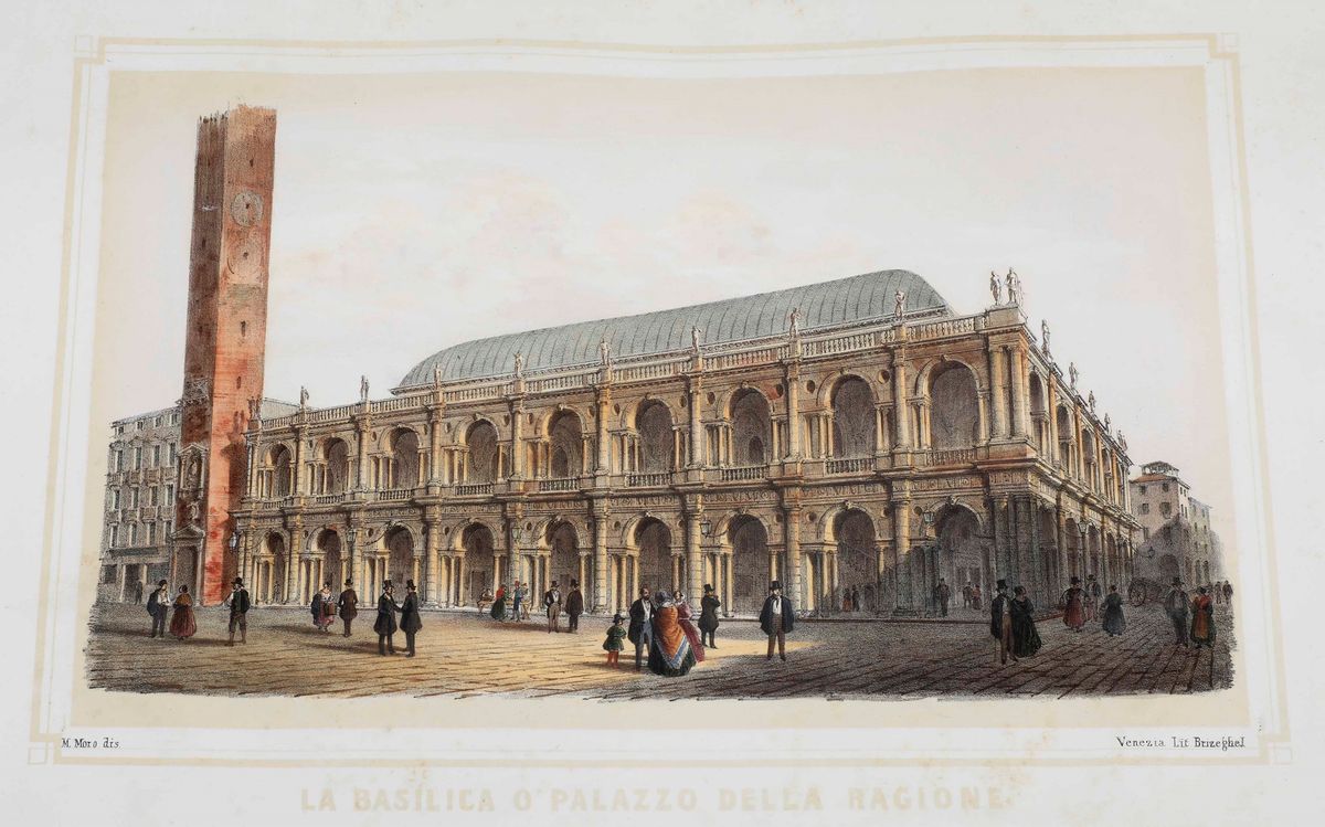 Zanetti, Giuseppe , e Marco Moro. Album di gemme architettoniche, ossia gli edifizi più rimarchevoli di Vicenza e del suo territorio rilevati da Giuseppe Zanetti, disegnati da Marco Moro e con cenni illustrativi dimostrati da Giulio Co. Pullè... Venezia, litografia di Giovanni Brizeghel, (1847-1856)