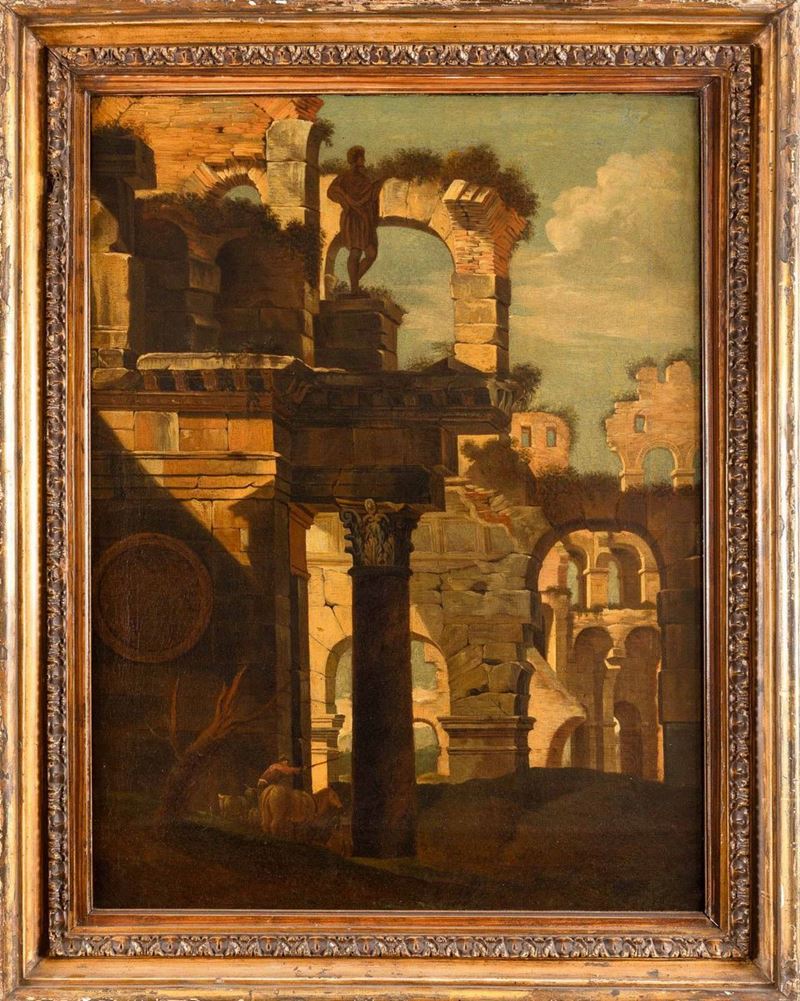Scuola del XVIII secolo Capriccio architettonico con rovine classiche e pastore